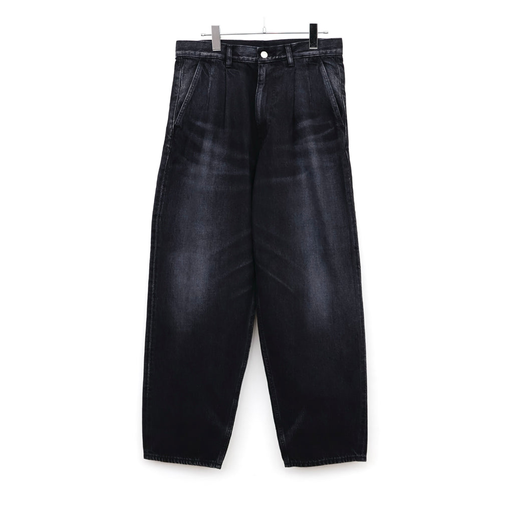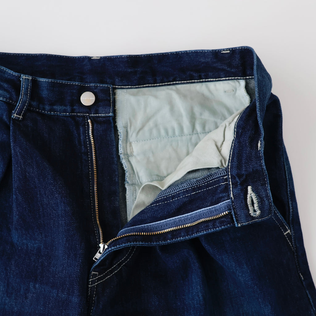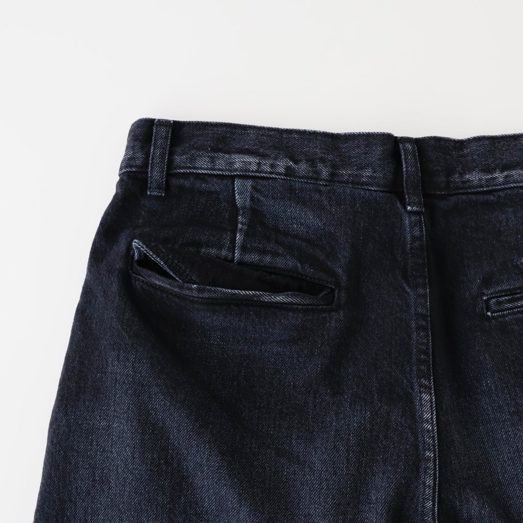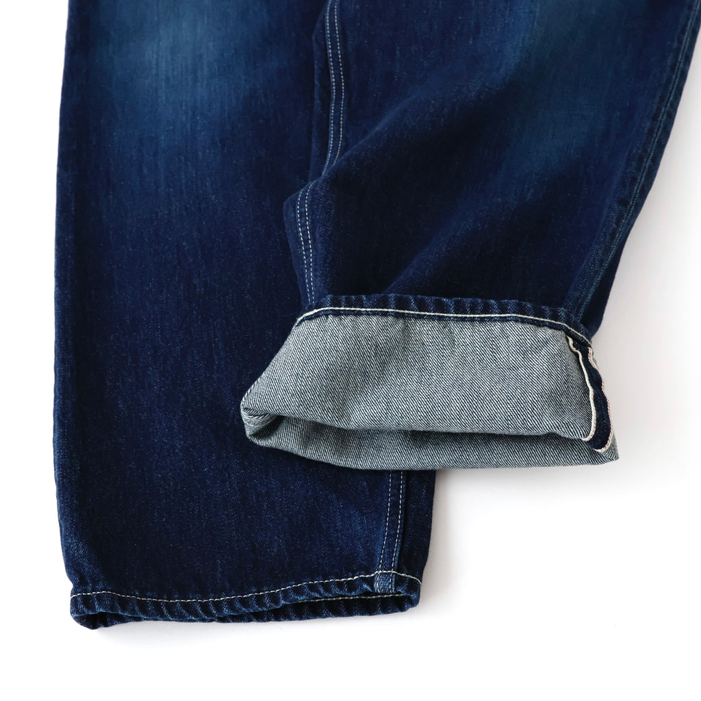 ウエストにはタックが入り、ヒップからワタリにかけて適度な余裕があり、裾にかけて若干テーパードしている履きやすいワイドテーパードパンツ。メリハリのある濃淡が特徴のダークフェイド。