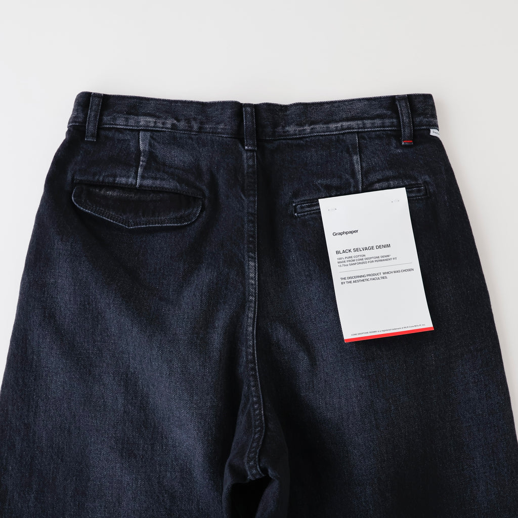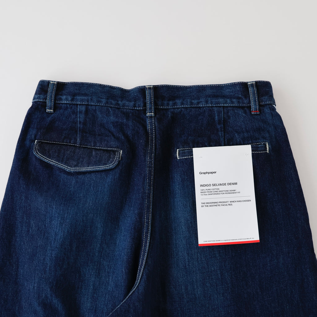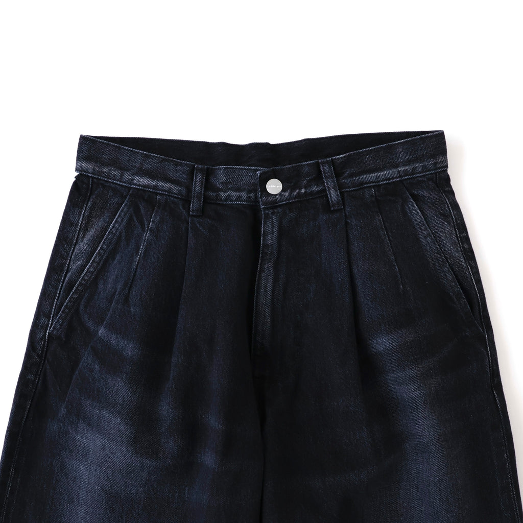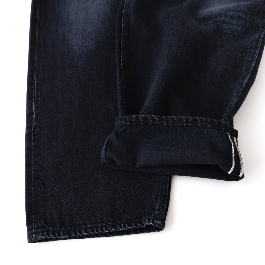 ウエストにはタックが入り、ヒップからワタリにかけて適度な余裕があり、裾にかけて若干テーパードしている履きやすいワイドテーパードパンツ。メリハリのある濃淡が特徴のダークフェイド。