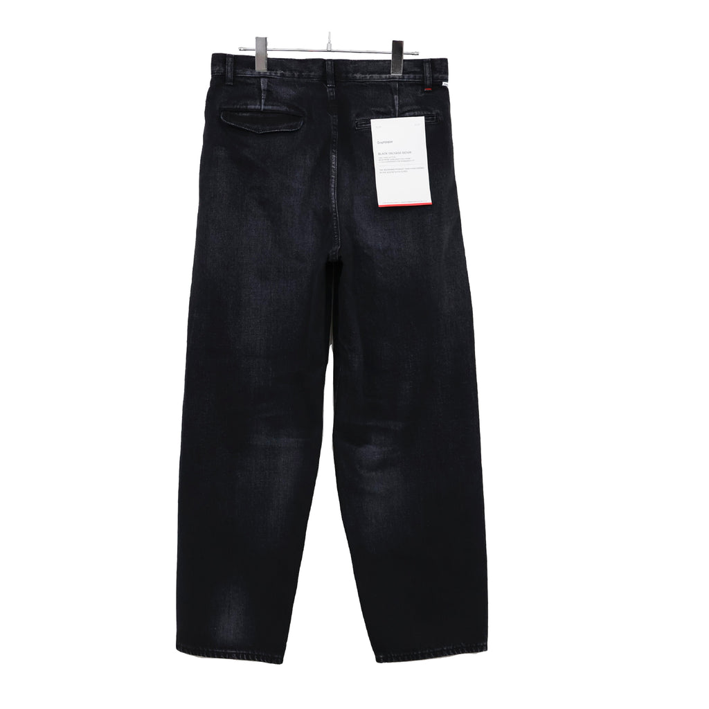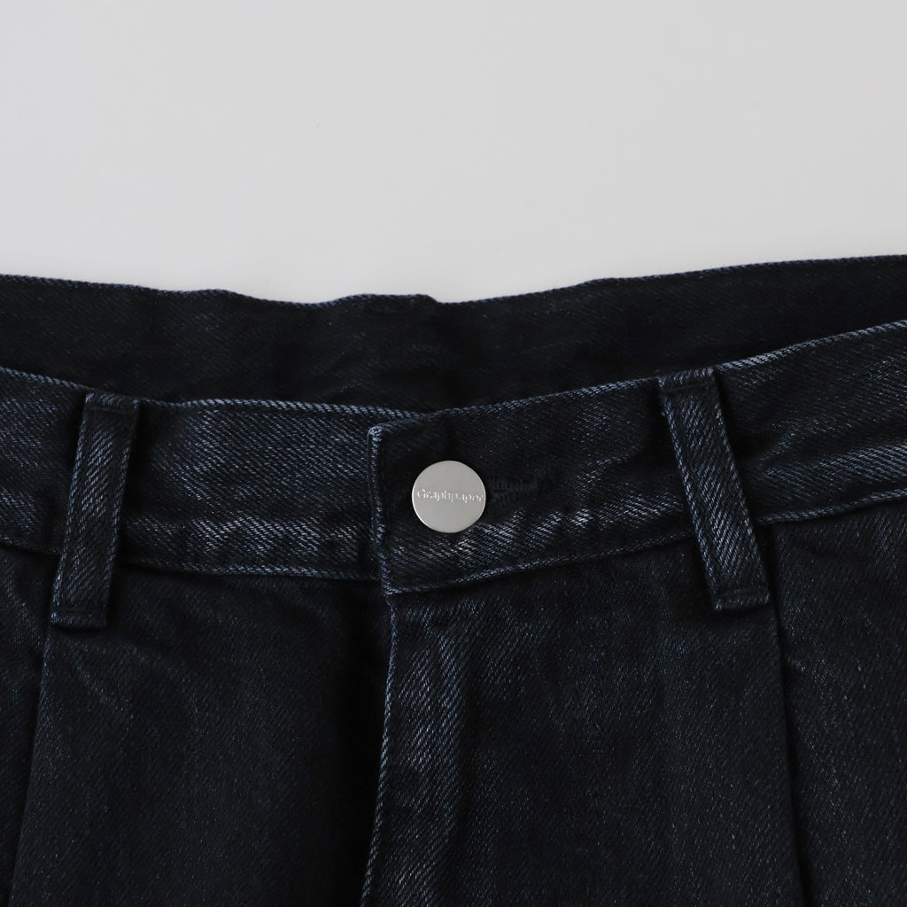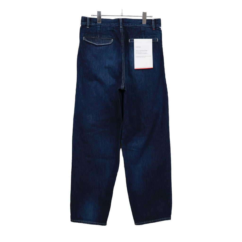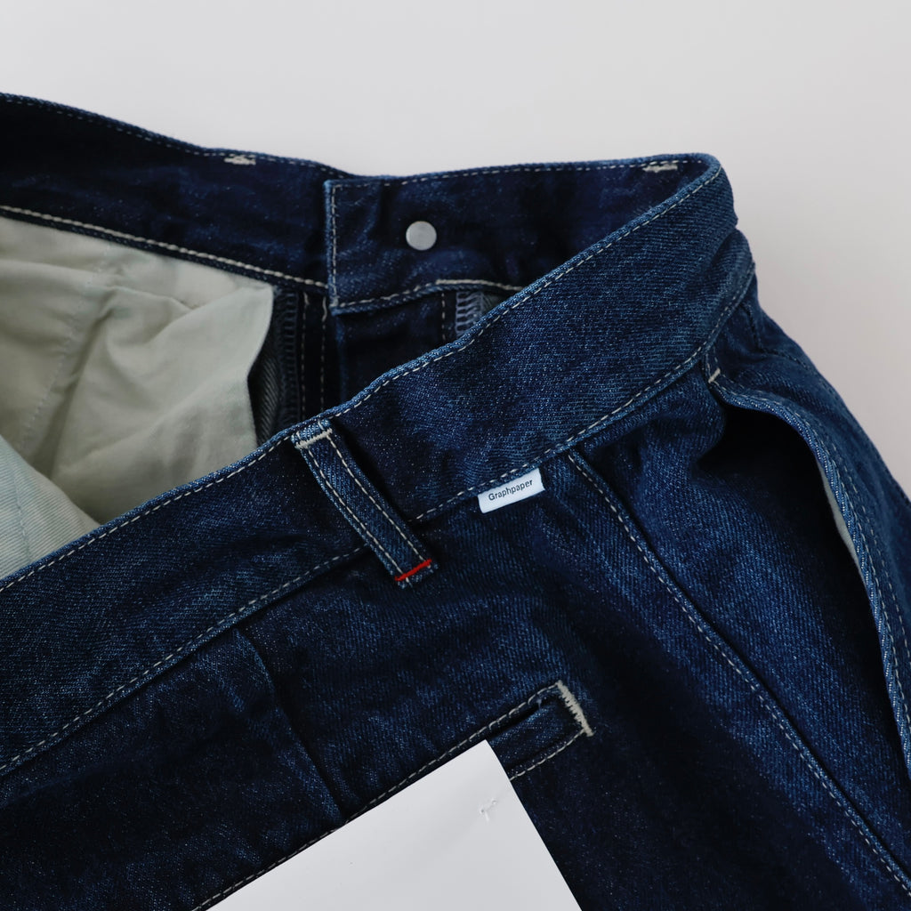 ウエストにはタックが入り、ヒップからワタリにかけて適度な余裕があり、裾にかけて若干テーパードしている履きやすいワイドテーパードパンツ。メリハリのある濃淡が特徴のダークフェイド。