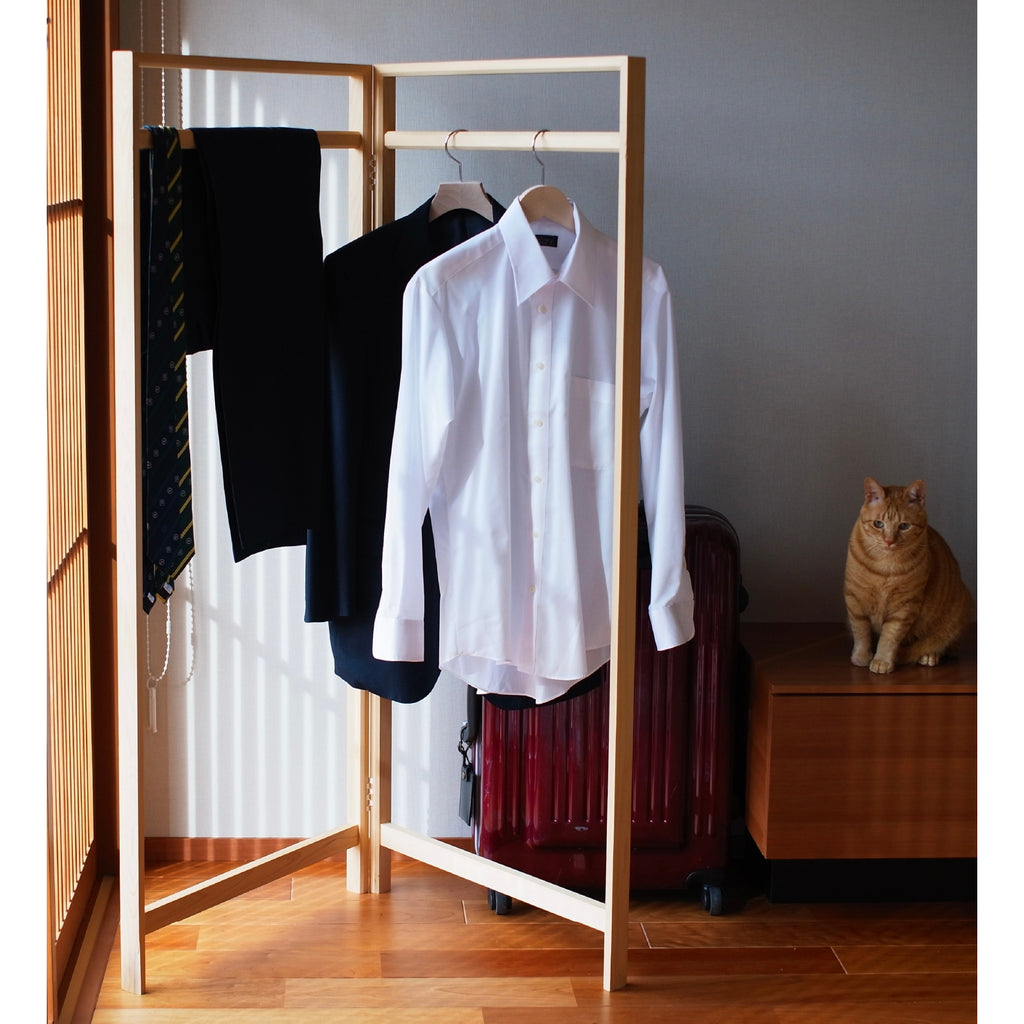 さまざまな着丈に対応する高さ、置く場所を限定しない幅、安定感のあるバランスを工夫しています。玄関や衣類を脱着する場所などにも重宝します。使用頻度の高い衣類を手軽にかけられ、また、花粉やたばこ、食事の匂いなどが付いて、すぐにはクローゼットに持ち込みたくない時にも便利。