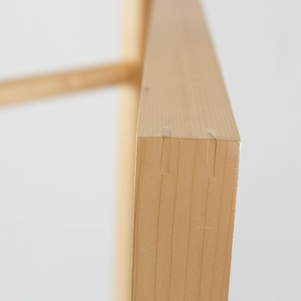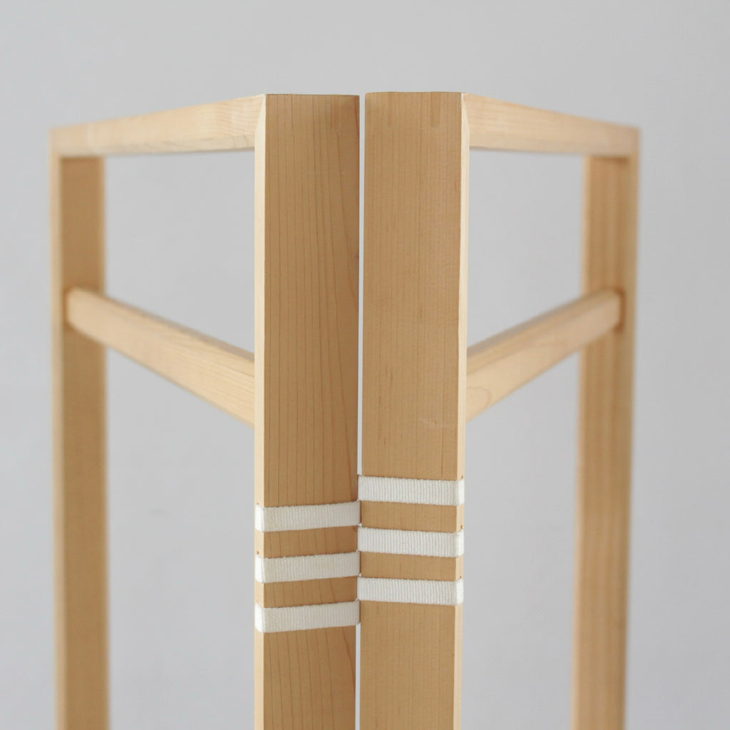 長野県で切り出された木曽ひのきを丁寧に乾燥させ、白木の美しさをそのままに、繊細な面取りをほどこし、ひとつひとつ組み上げています。可動部には金属ではなく紐で留める「紐蝶番」を使用。木を割らず、削り出すことで溝を作り、紐を通しています。自在な開閉が可能なため、お部屋の形や大きさを問わずに自由にお使いいただけます。紐蝶番に使用した真田紐は、組紐とは異なり縦糸と横糸で織り上げるため伸びにくく、さらに袋織りという技法を用いる事で、より丈夫に作られています。特に木綿製は摩擦に強く、紐蝶番に適しています。日々の暮らしに活用できるよう、ハンガーや衣類を直にも掛けられる形に仕立てられています。