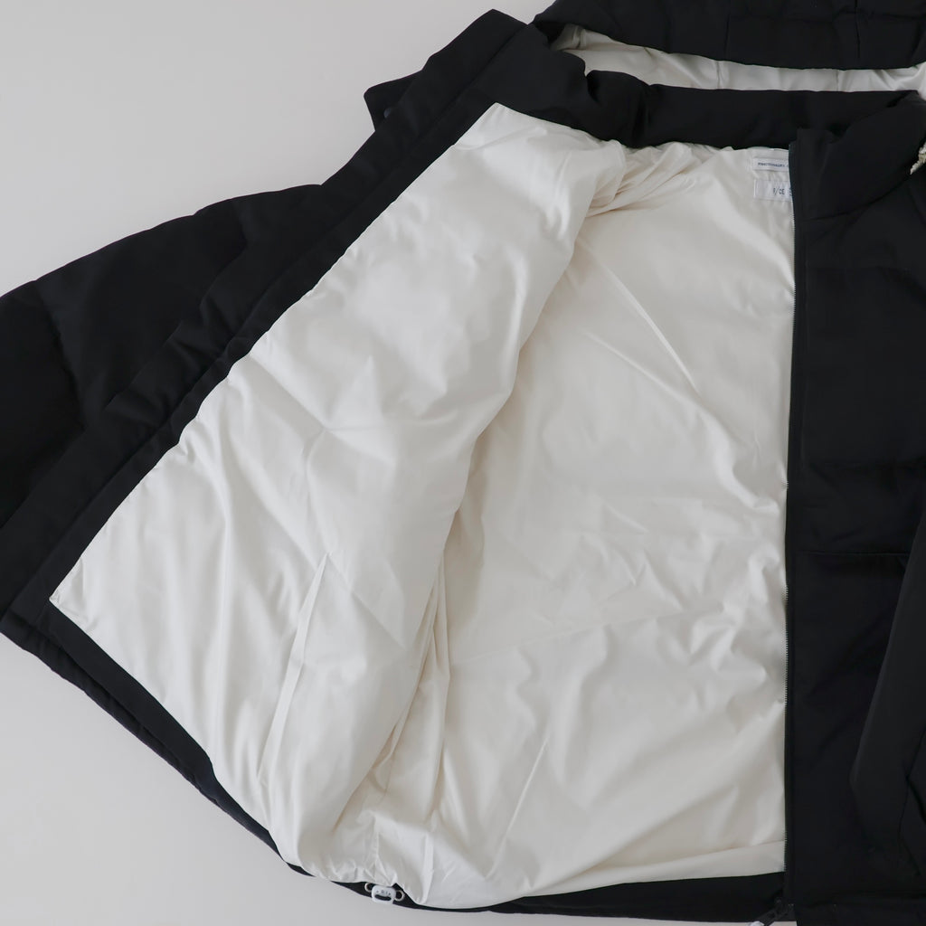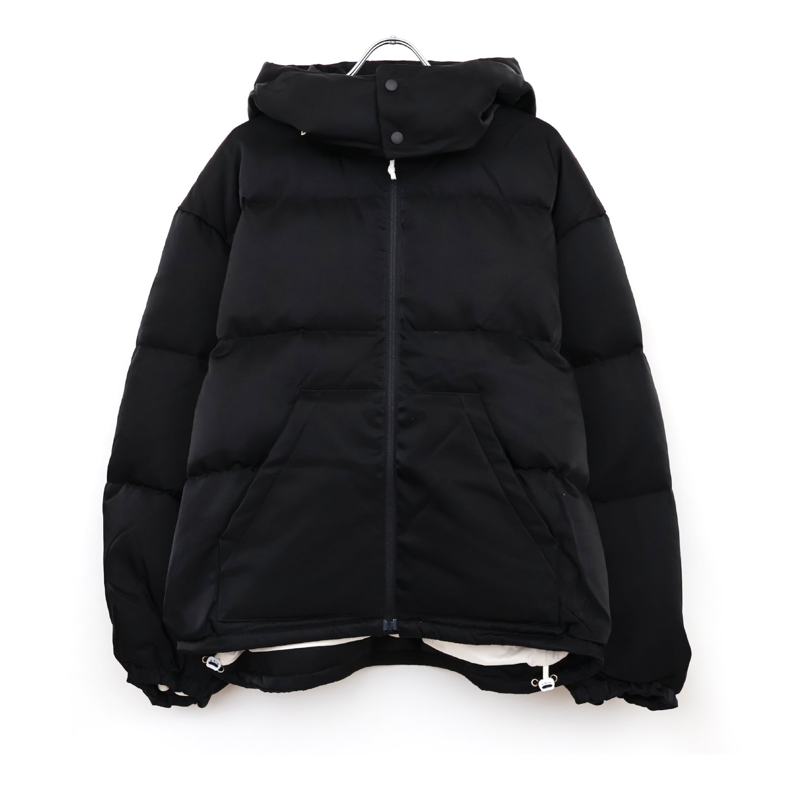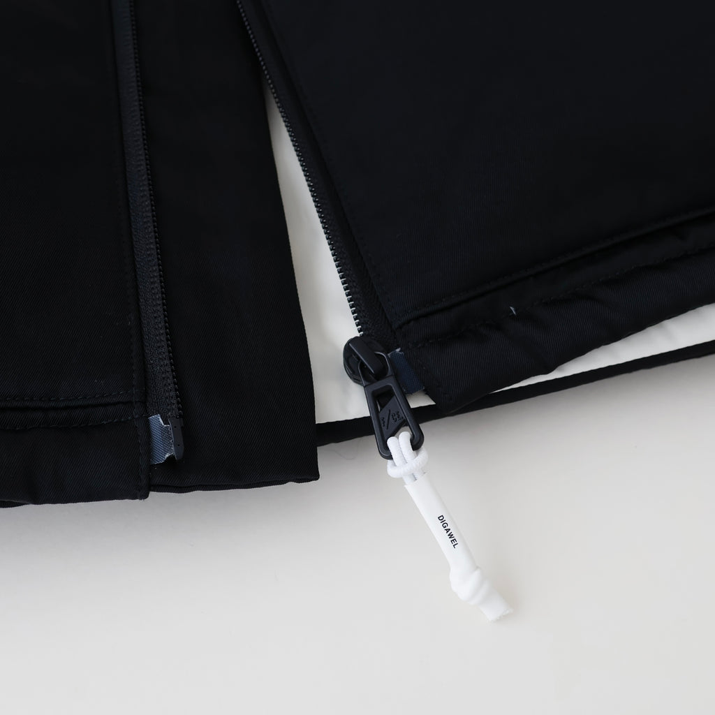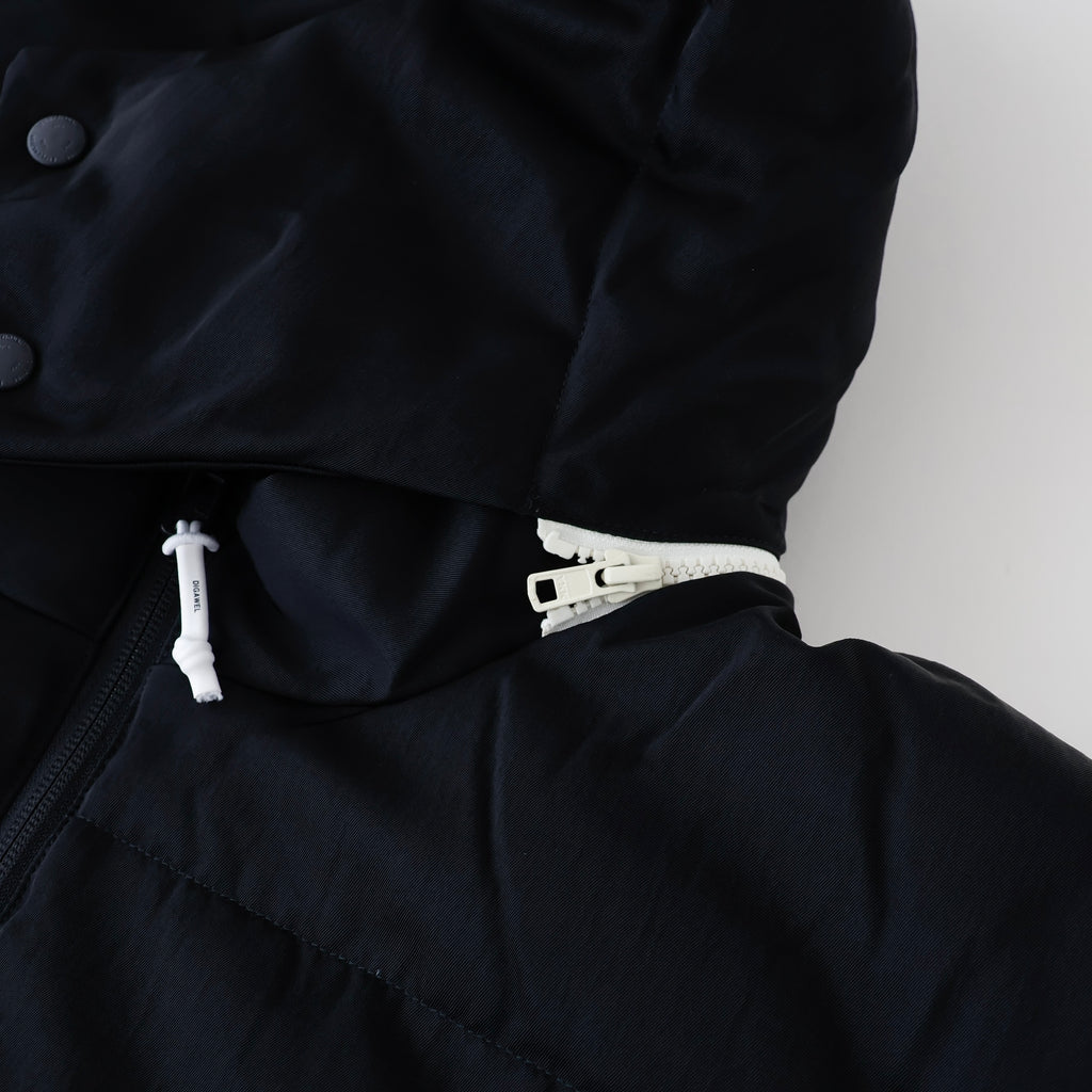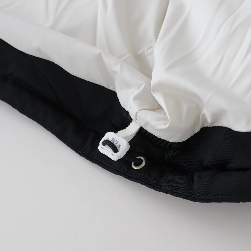 裾のスピンドルでシルエットの調節が可能。ファスナー・引き手・裏地をオフ白の配色がアクセントになっています。