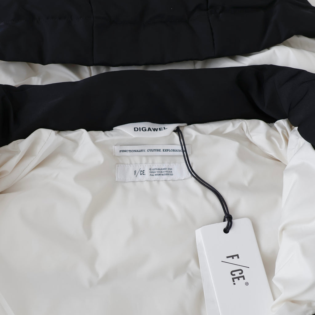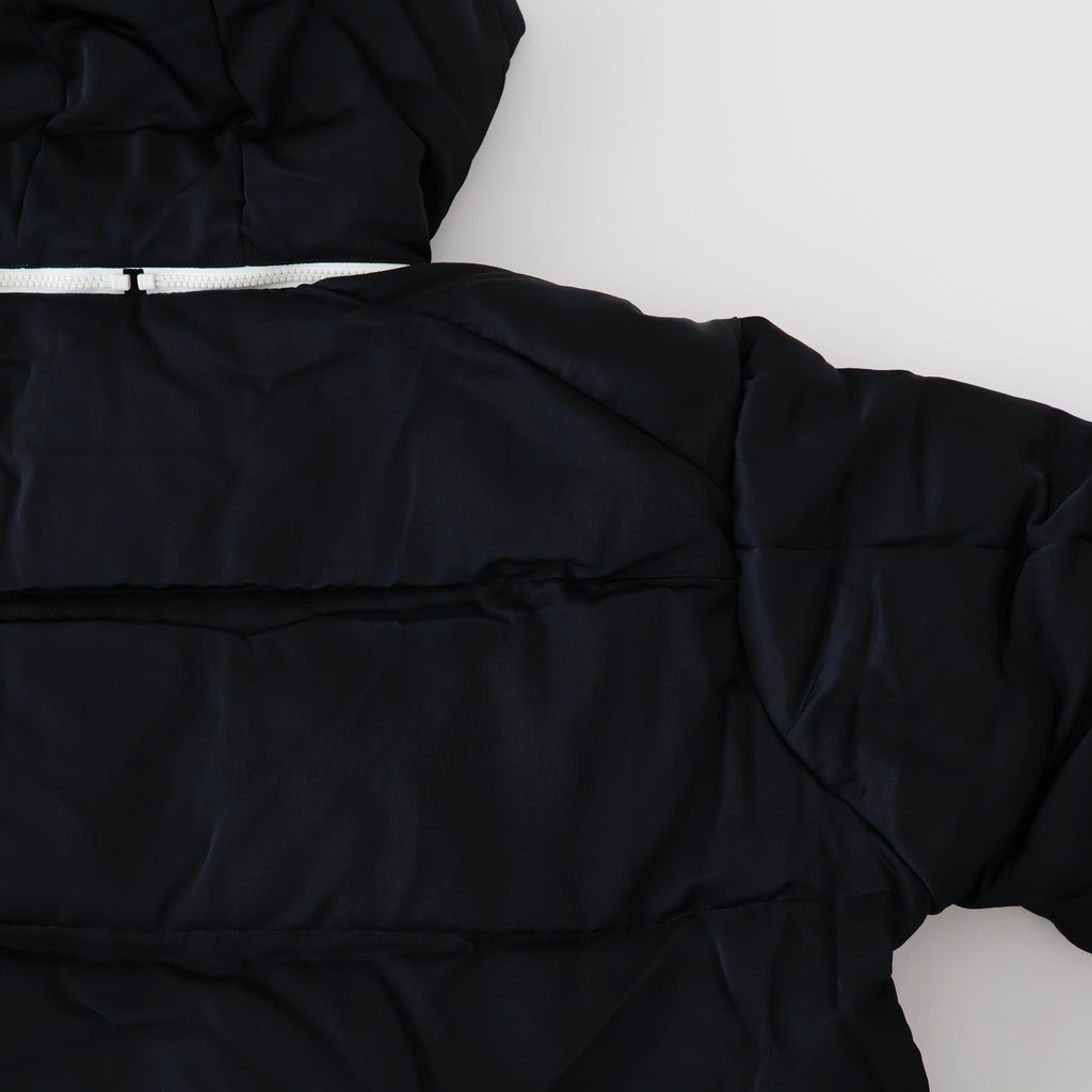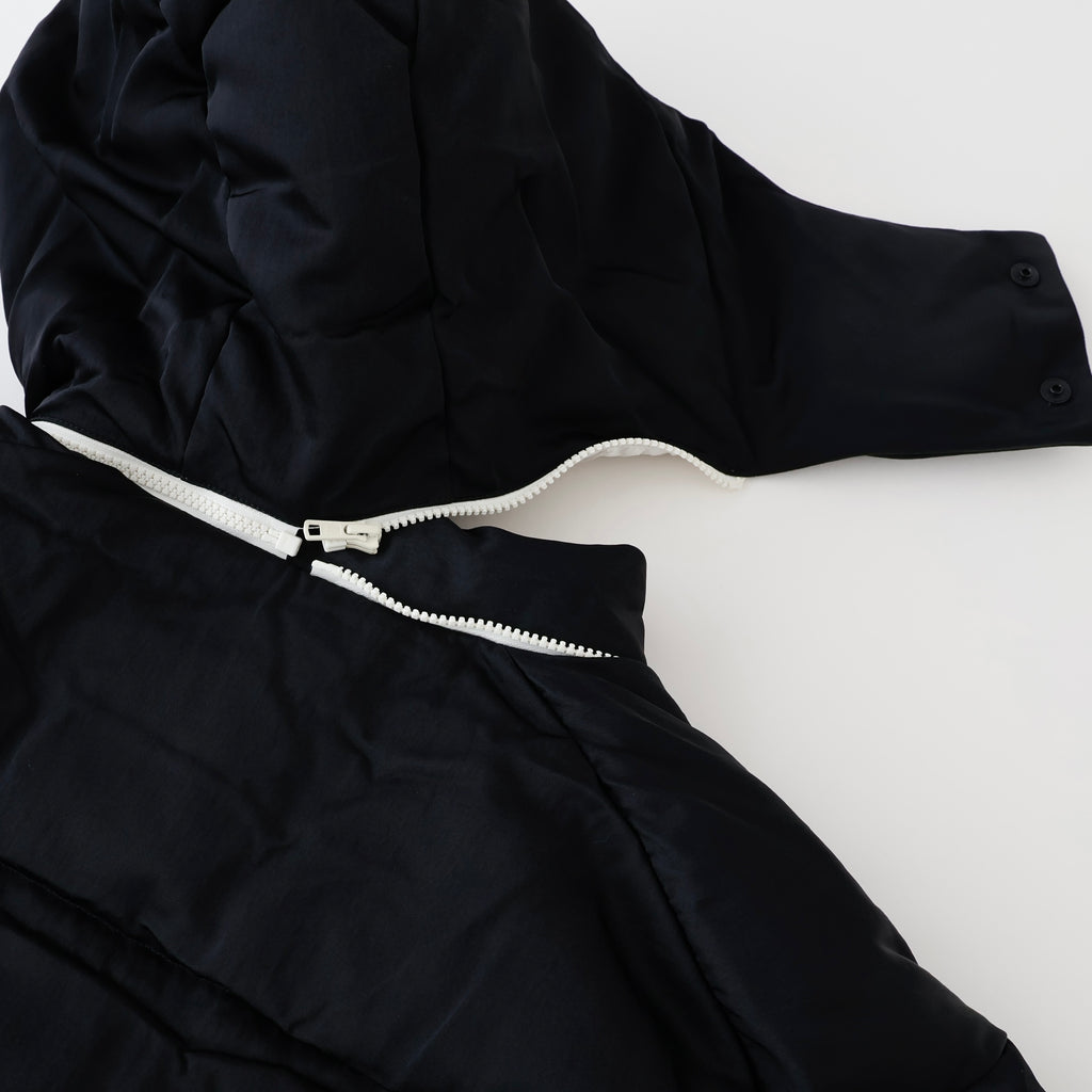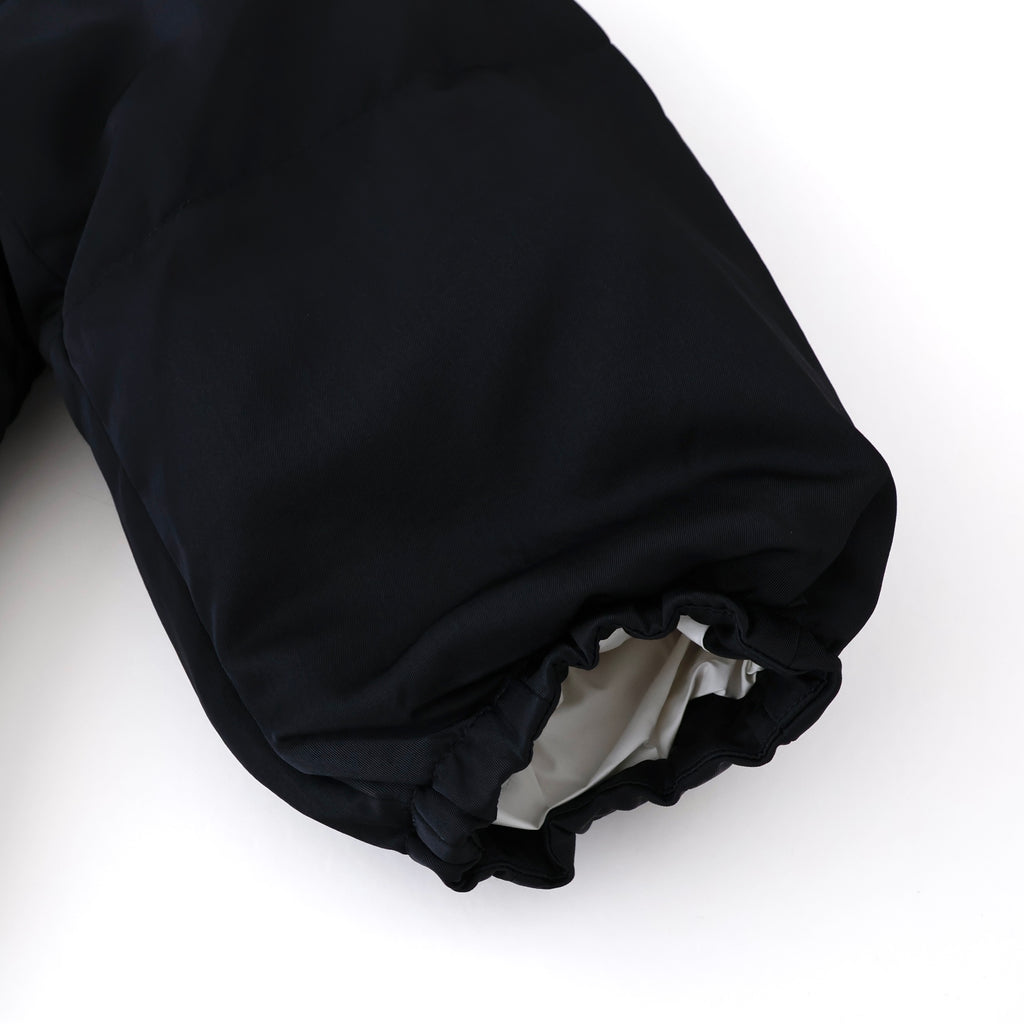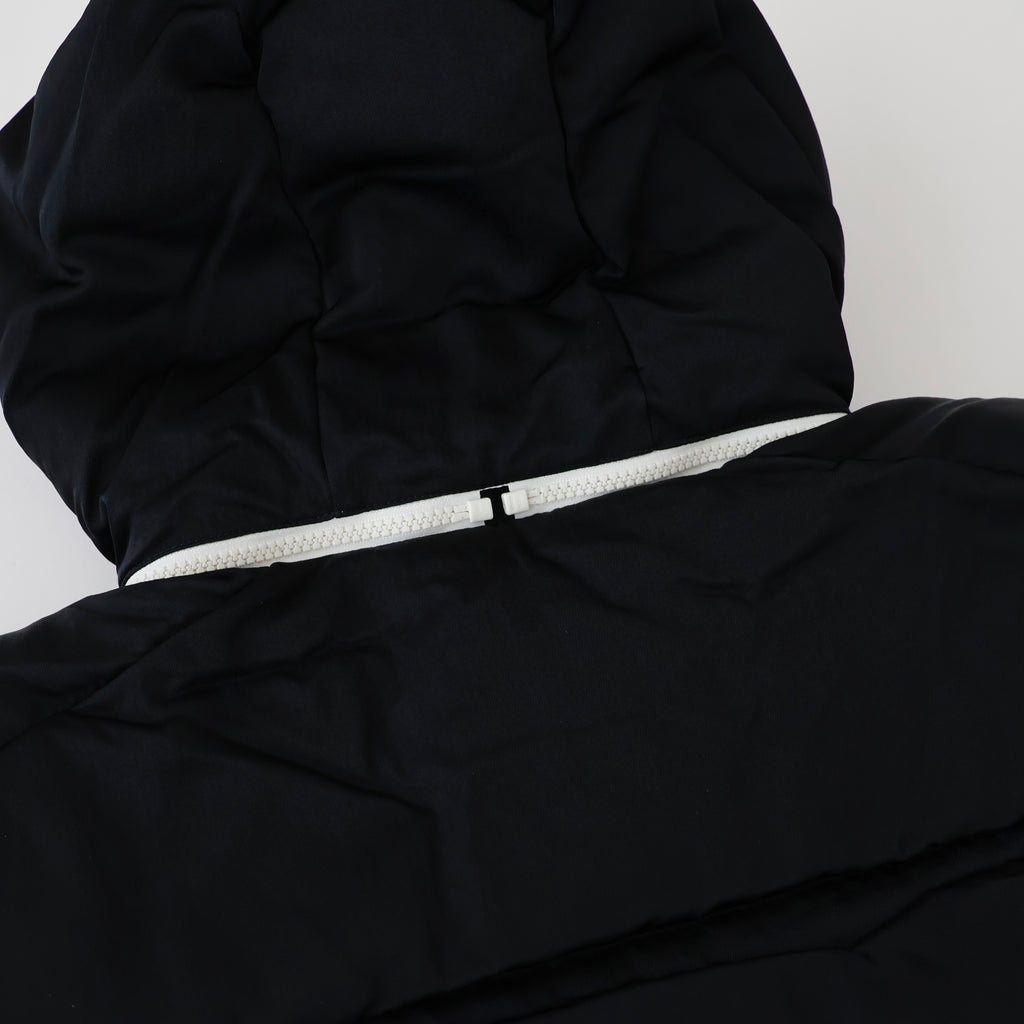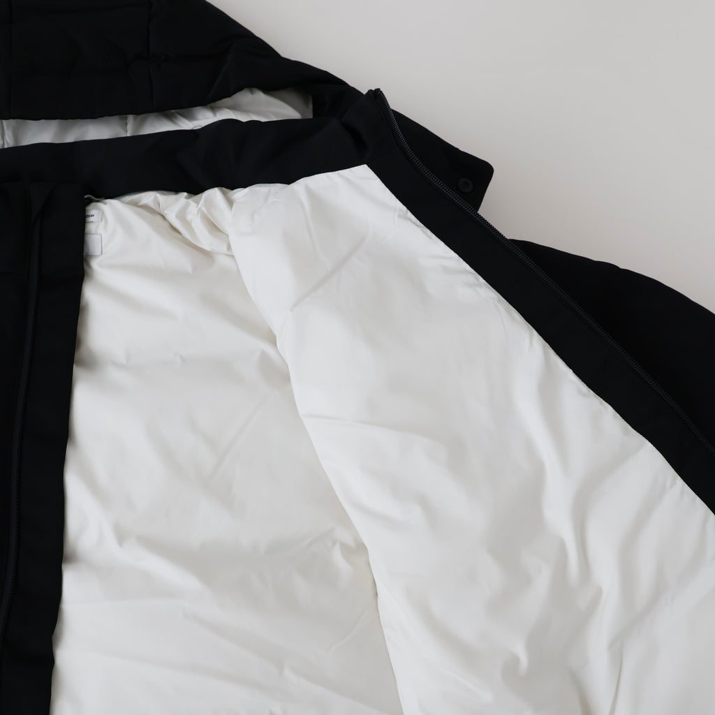 裾のスピンドルでシルエットの調節が可能。ファスナー・引き手・裏地をオフ白の配色がアクセントになっています。