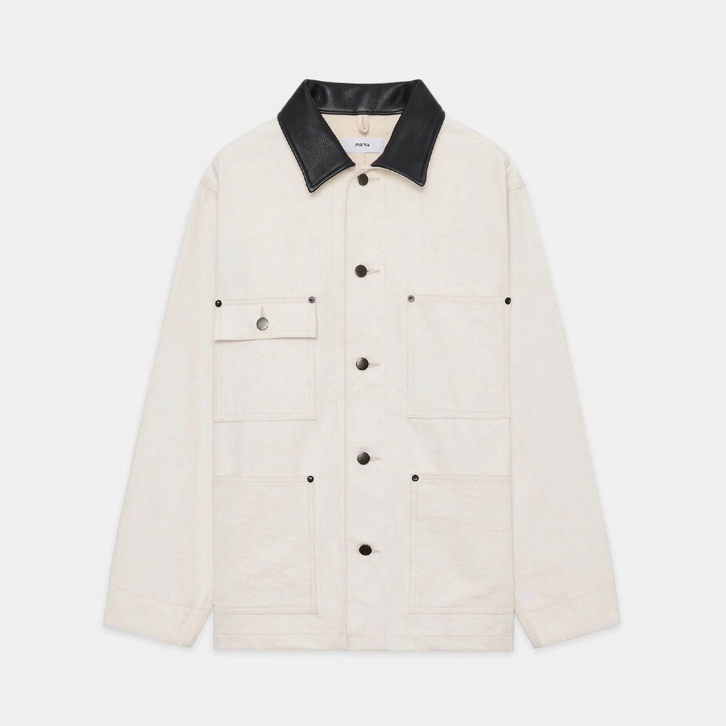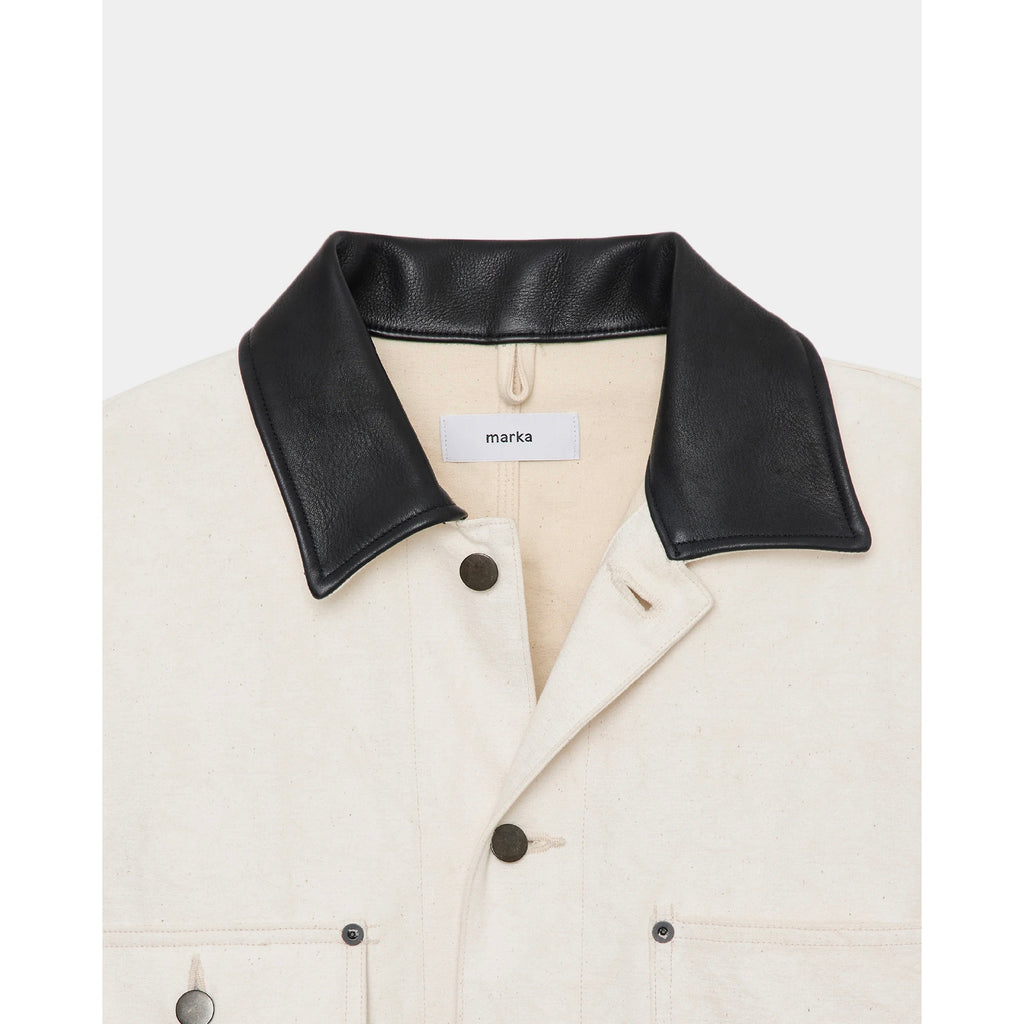 コーティングされたハリのある生地は、一重仕立てながらもしっかりとシルエットを際立たせます。襟部分には艶を抑えたウォッシャブルレザーを採用し、家庭での洗濯が可能な点も実用的です。さらに、襟のレザーに合わせてボタンもブラックで統一し、全体のデザインに調和を持たせました。