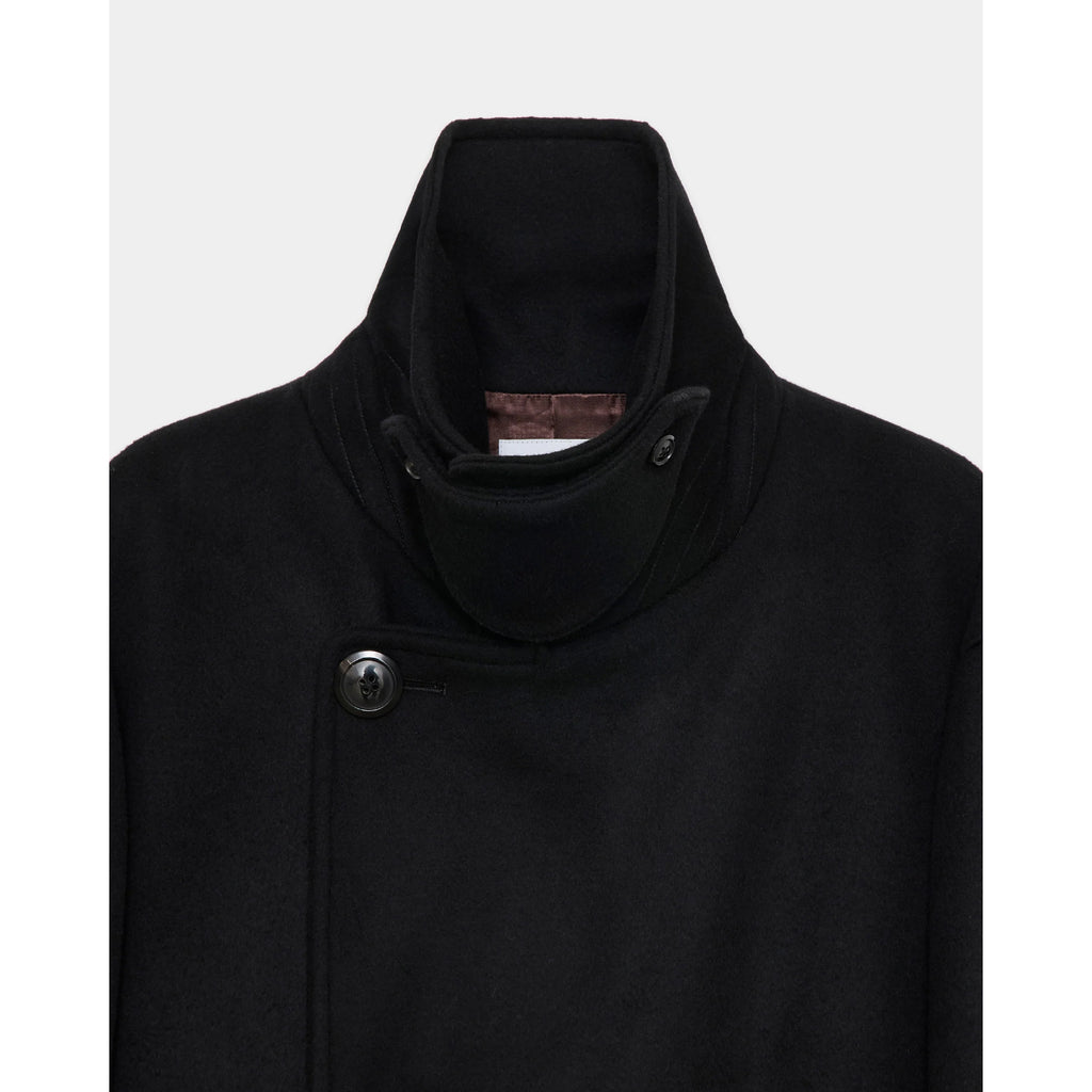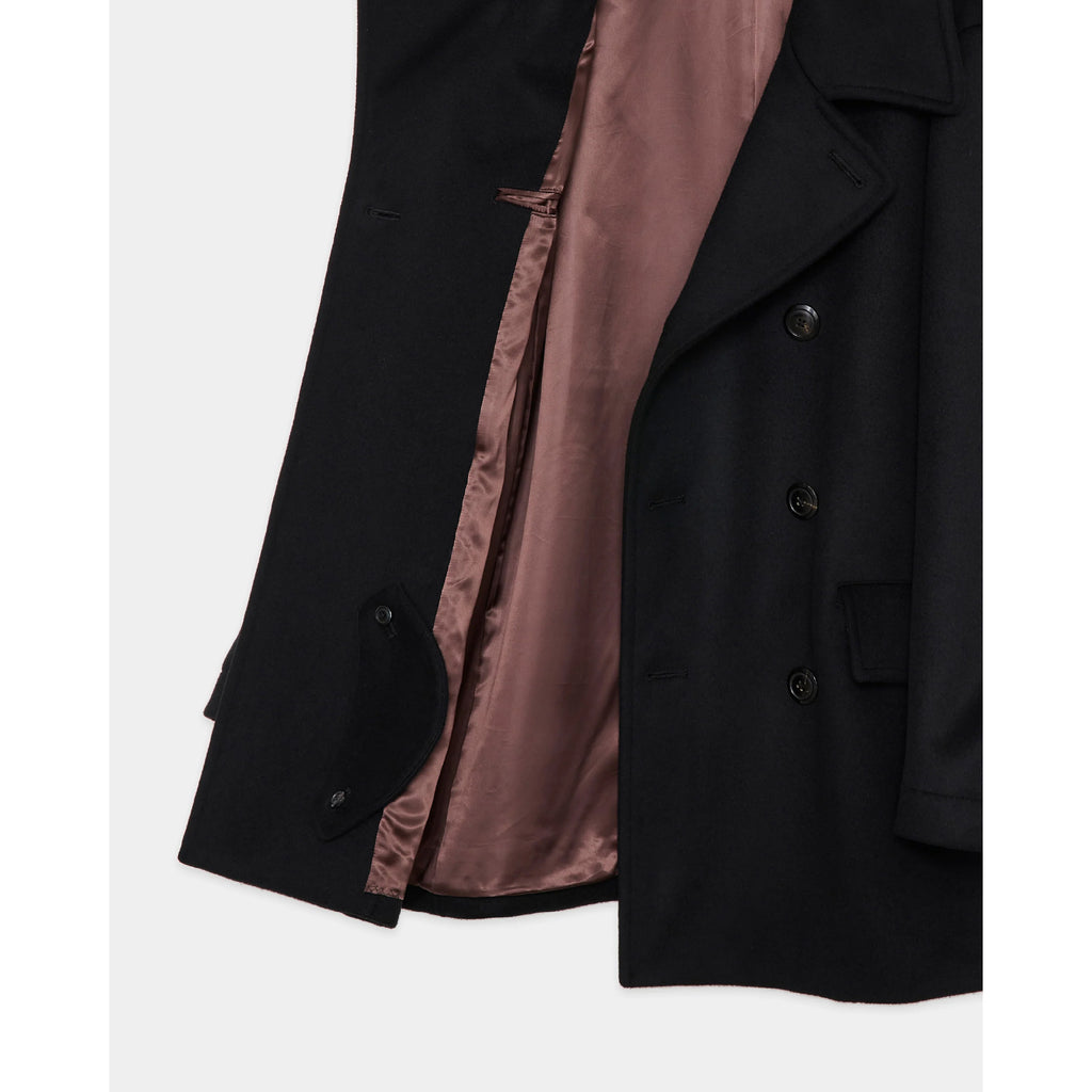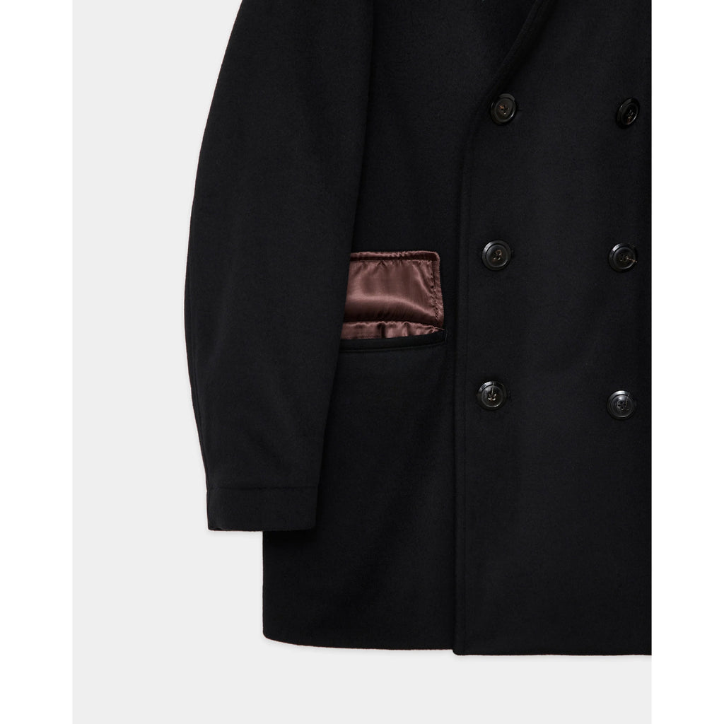 見返し裏のチンストラップで襟を立てた着こなしも可能です。総裏にはキュプラサテンを用い、防寒性を高めるとともに快適な着心地を実現。