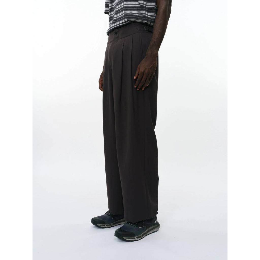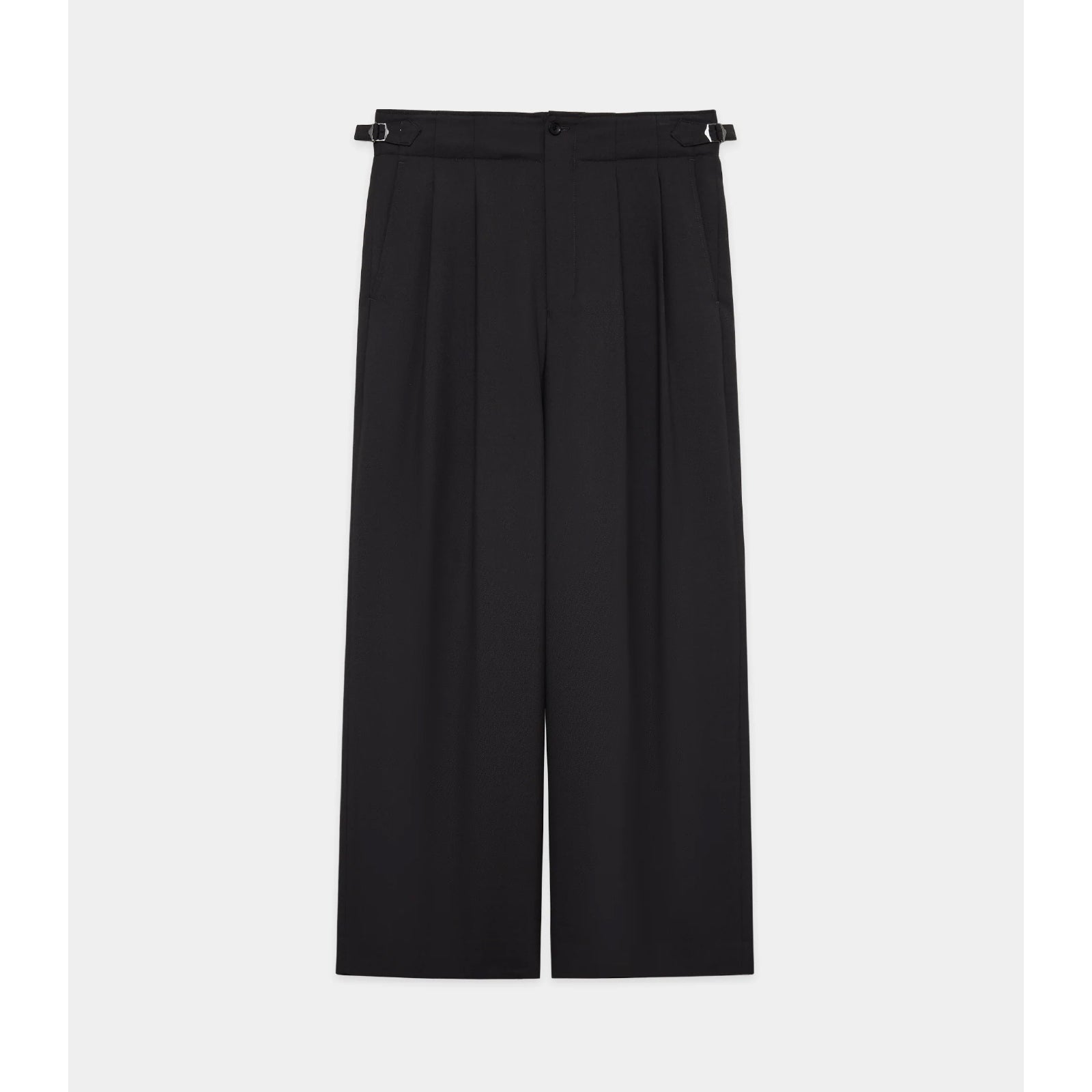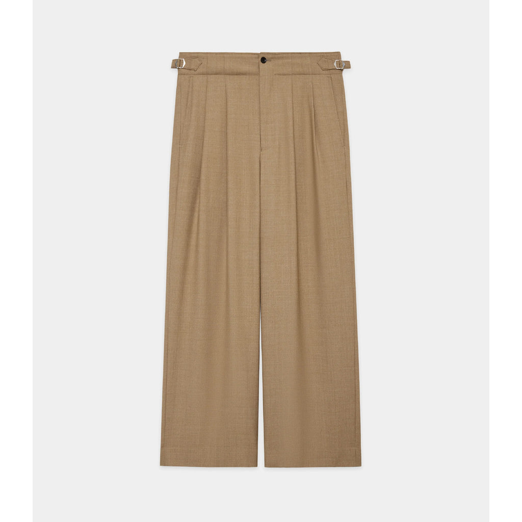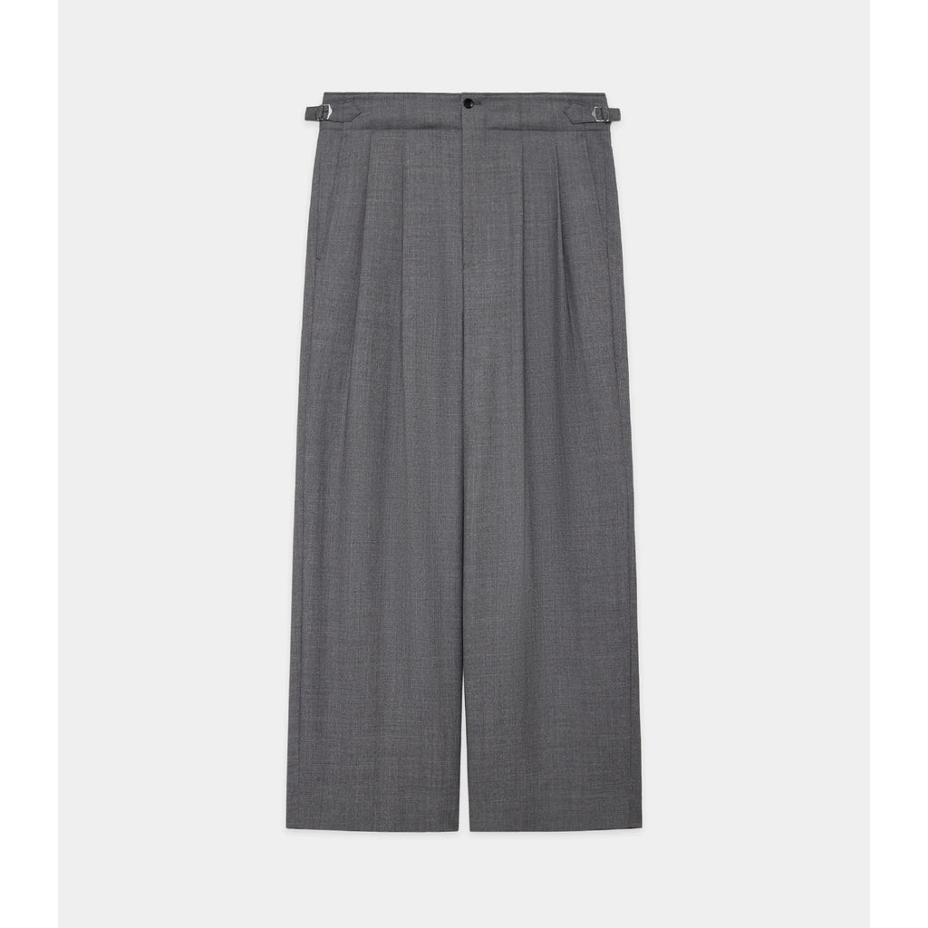 従来の1タック仕様を2タックに変更することで、フロントに豊かなドレープと陰影を生み出し、よりドレッシーな印象に仕上げています。ウエストは身頃続きのベルトレス設計で、約15cmの調整が可能なサイドアジャスト仕様。ハイウエストから腰履きまで、自在な着こなしを楽しめます。