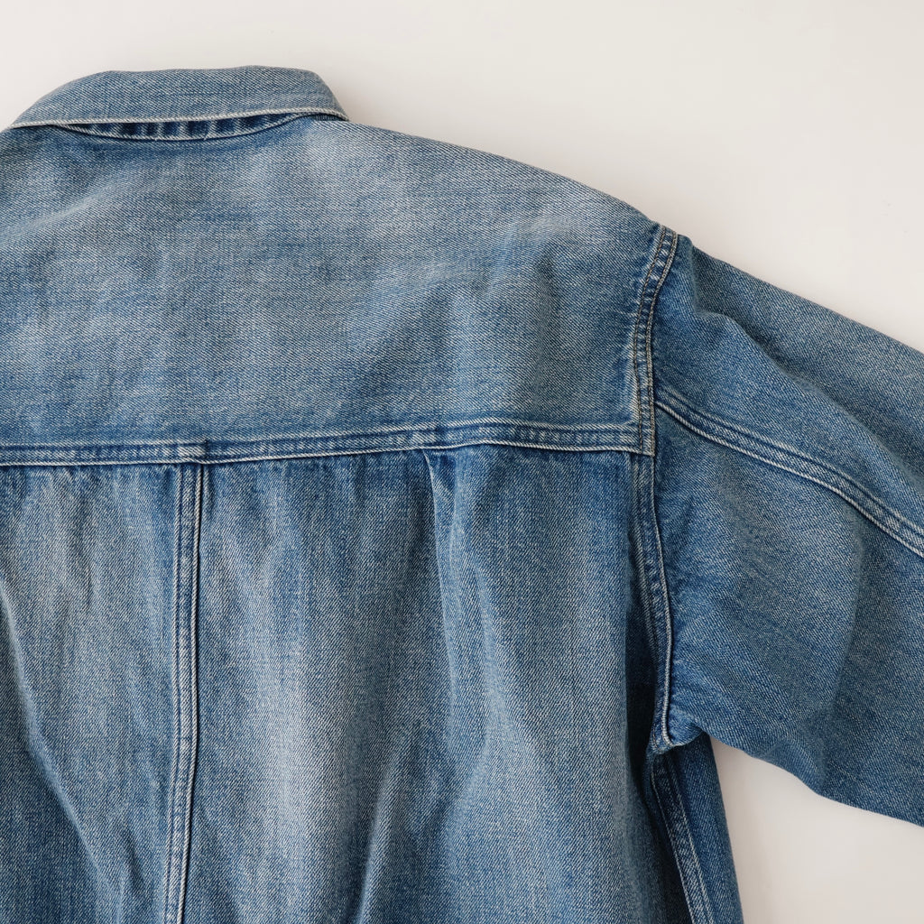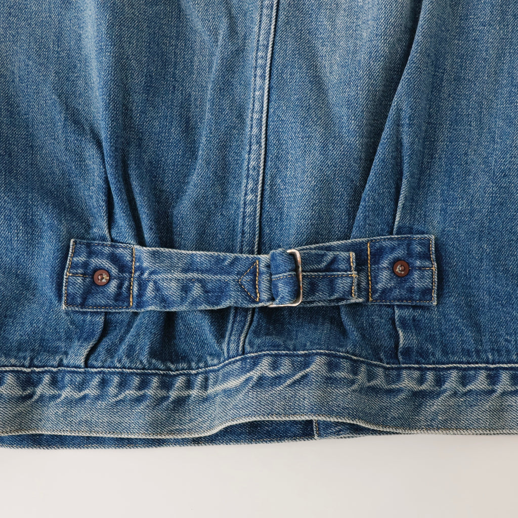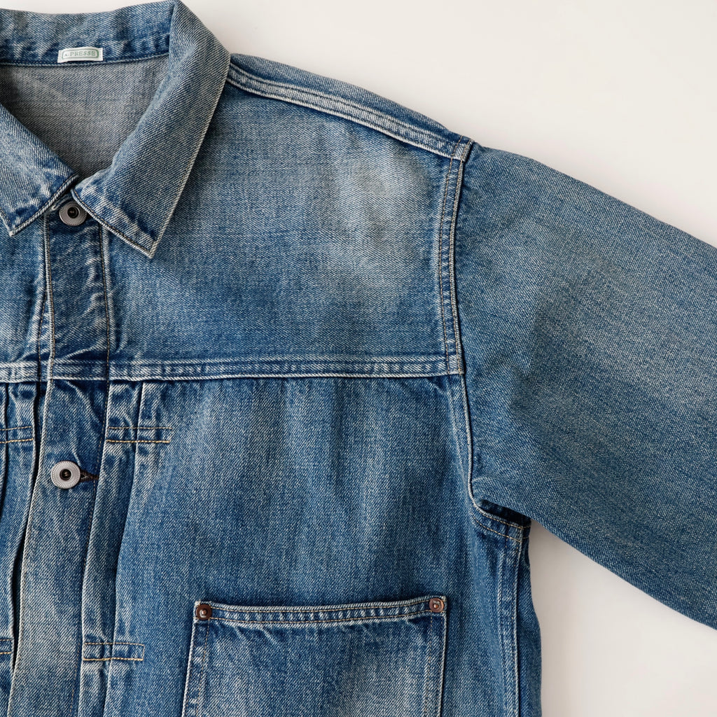 自然な経年変化を、手作業により再現。ヴィンテージを再現した加工感は、耳の色落ちまでこだわり、経年変化での退色したグレーカラーのセルビッチも特徴。