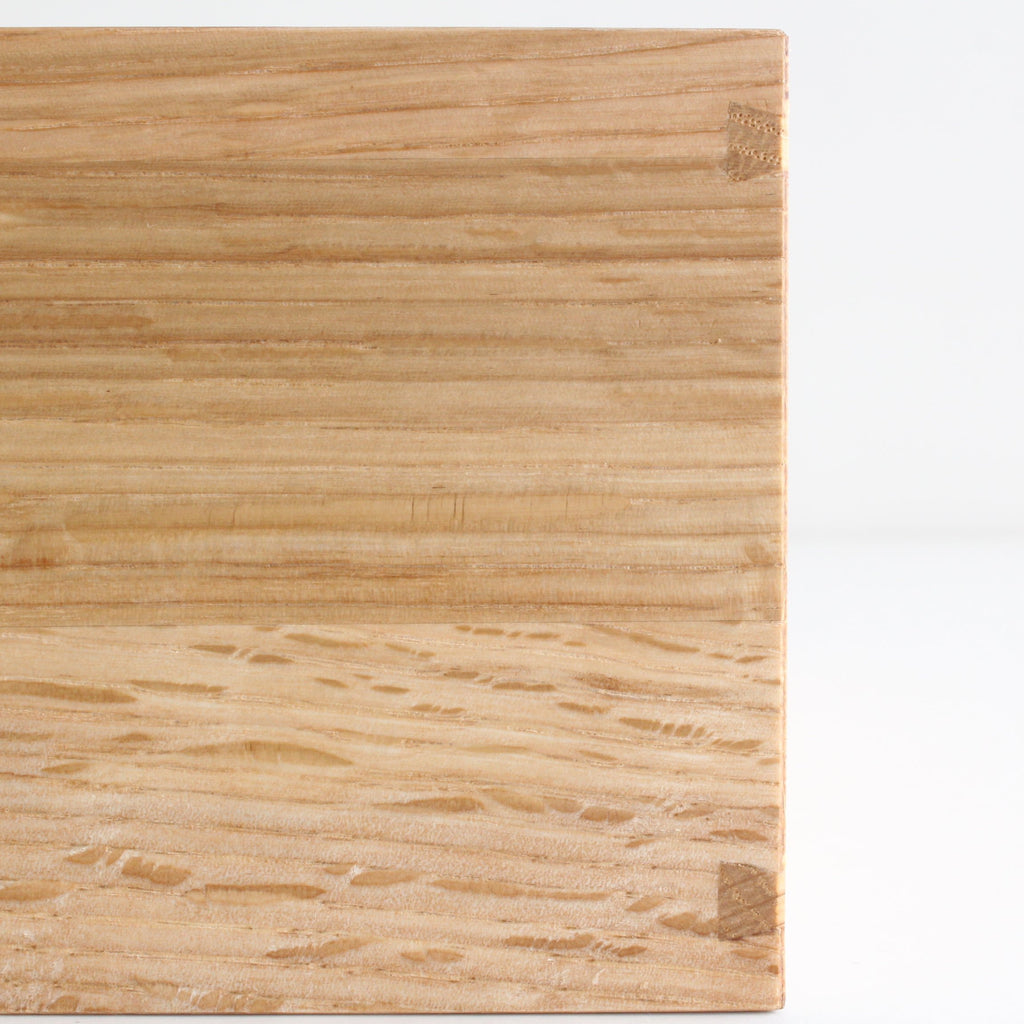釘やねじを使わず組み上げ、仕上げに胡桃油を拭き込みます。仕上げに蜜蝋+荏胡を塗り込むことで水分の吸収を抑えてシミや反りを抑えています。