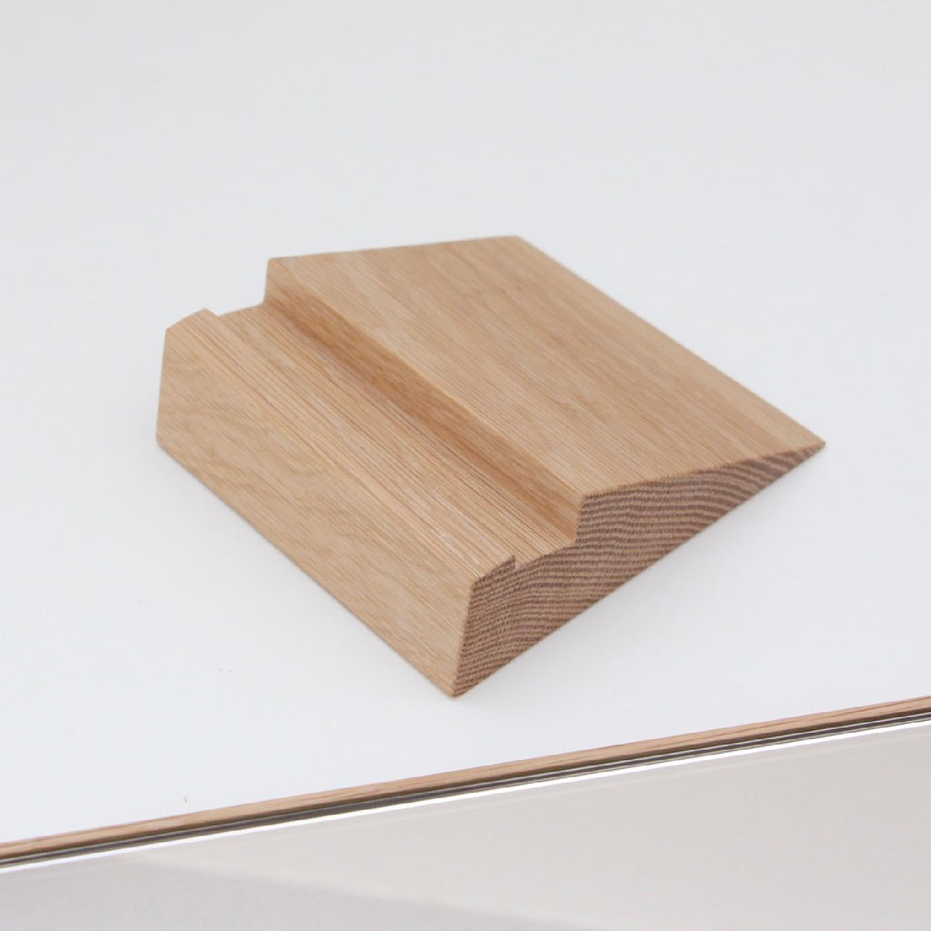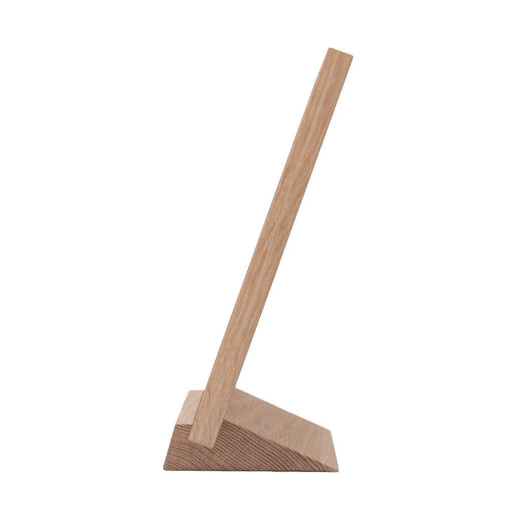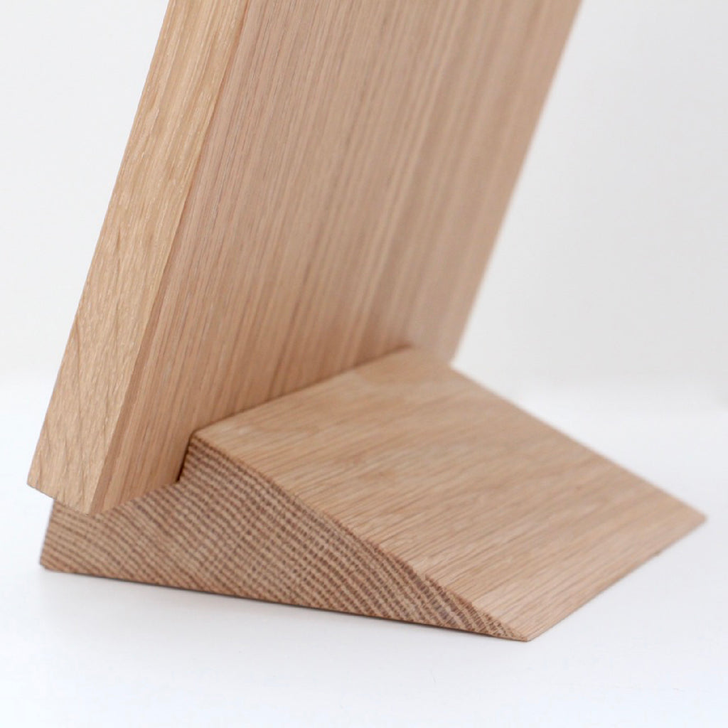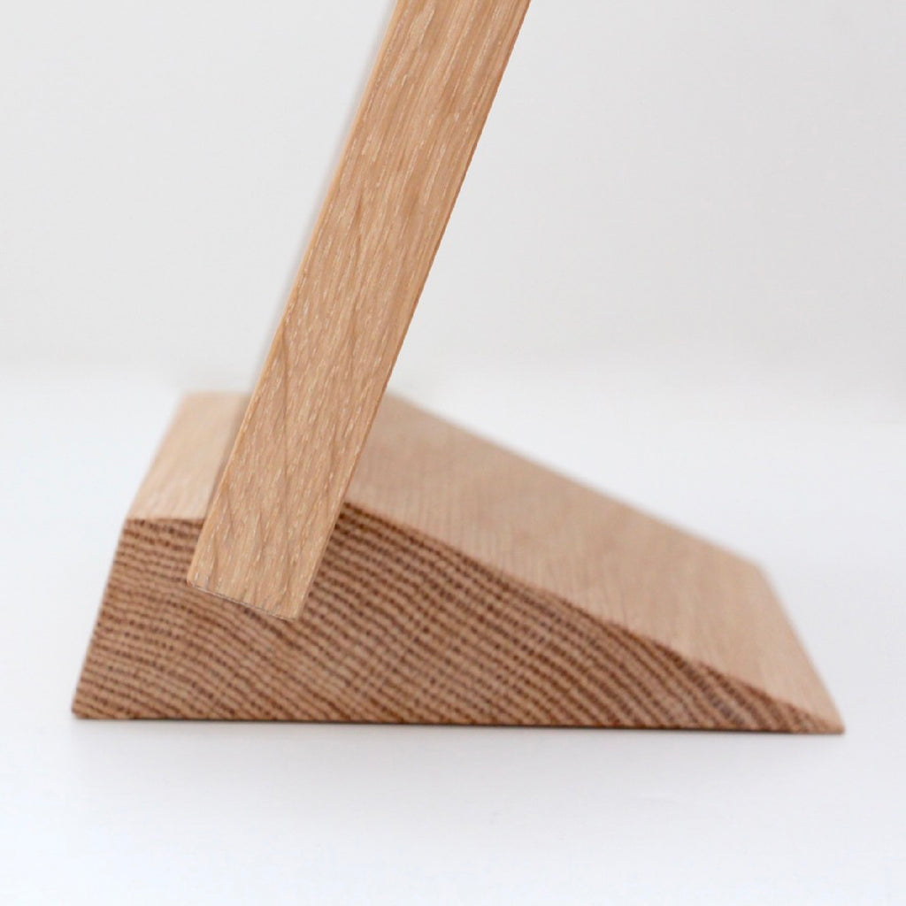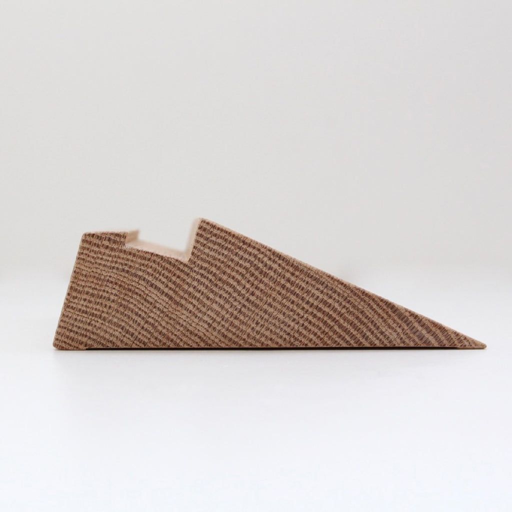 木のブロックにテーパーをかけスタイリッシュなデザインに。差し込み口は鏡面が被らないようにぎりぎりまで溝を浅くし、そこへ本体を差し込んだ時の絶妙なバランスがとれた仕上がり。
