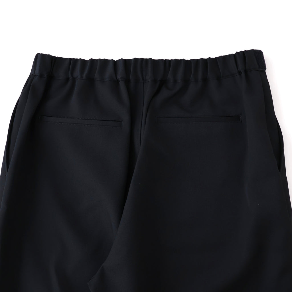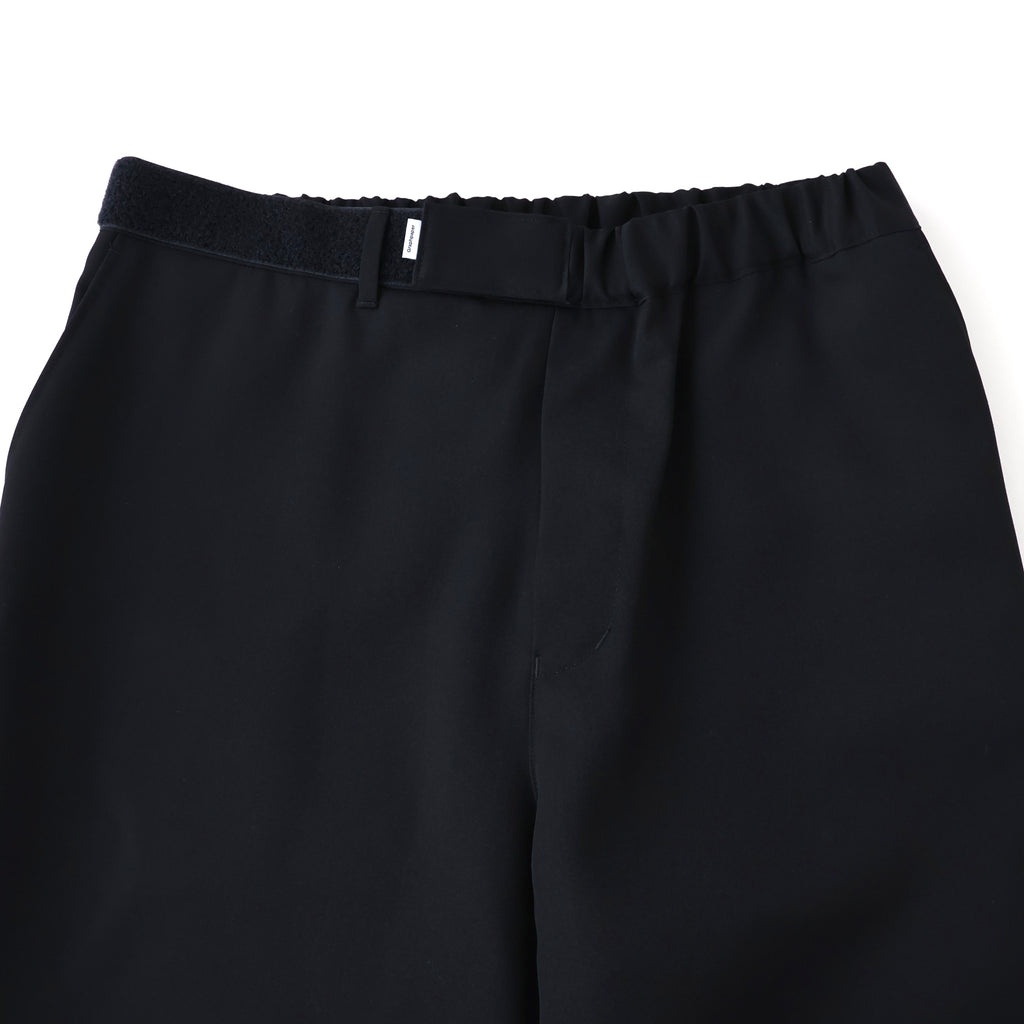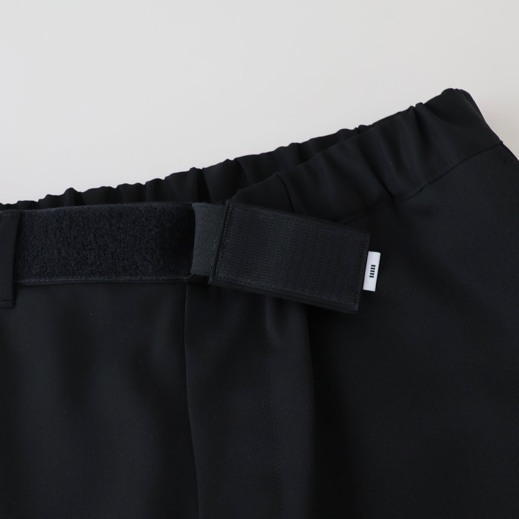 ウエストのサイズを簡単に調整できてシルエットもアレンジ可能です。美しい綾目を表現する為に、縦糸を高密度に、横糸は限界まで打ち込んだウールギャバジン素材を使用。特殊な樹脂をウール繊維の内部まで染み込ませることでフィラメントのような光沢とクリアな質感に仕上げています。