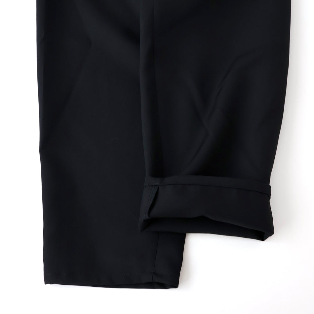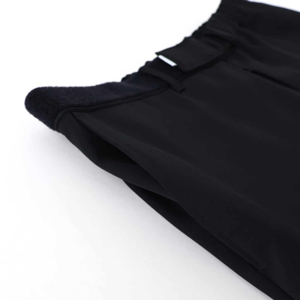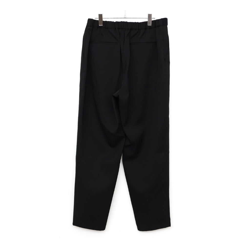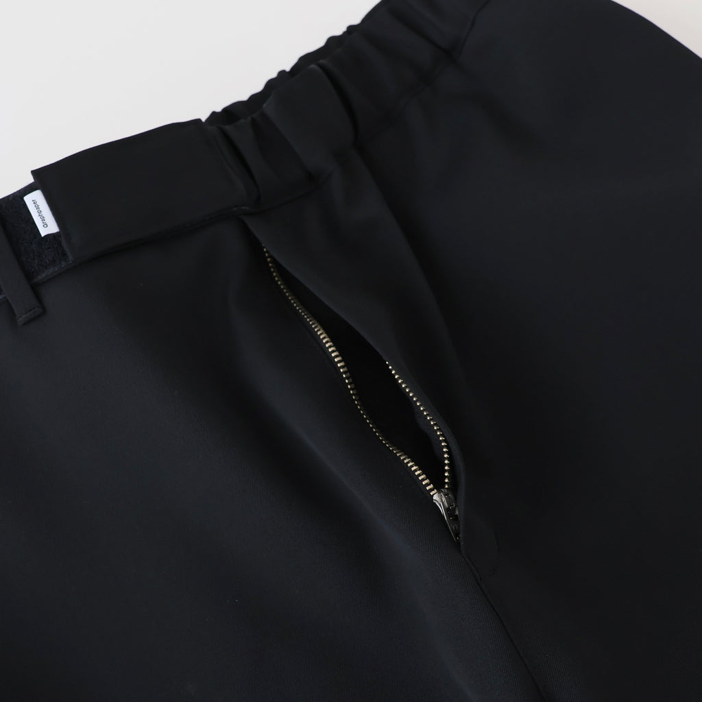 ウエストのサイズを簡単に調整できてシルエットもアレンジ可能です。美しい綾目を表現する為に、縦糸を高密度に、横糸は限界まで打ち込んだウールギャバジン素材を使用。特殊な樹脂をウール繊維の内部まで染み込ませることでフィラメントのような光沢とクリアな質感に仕上げています。