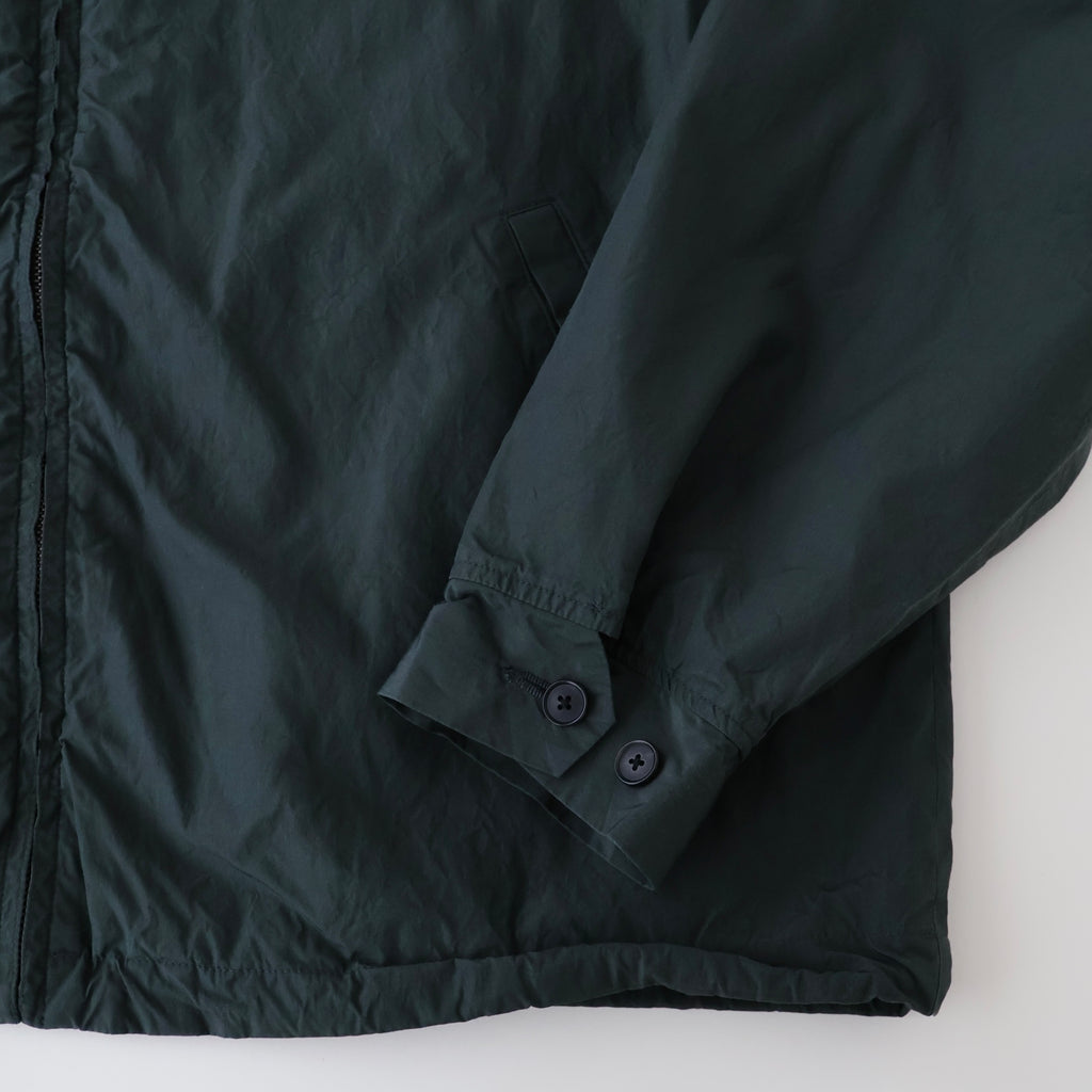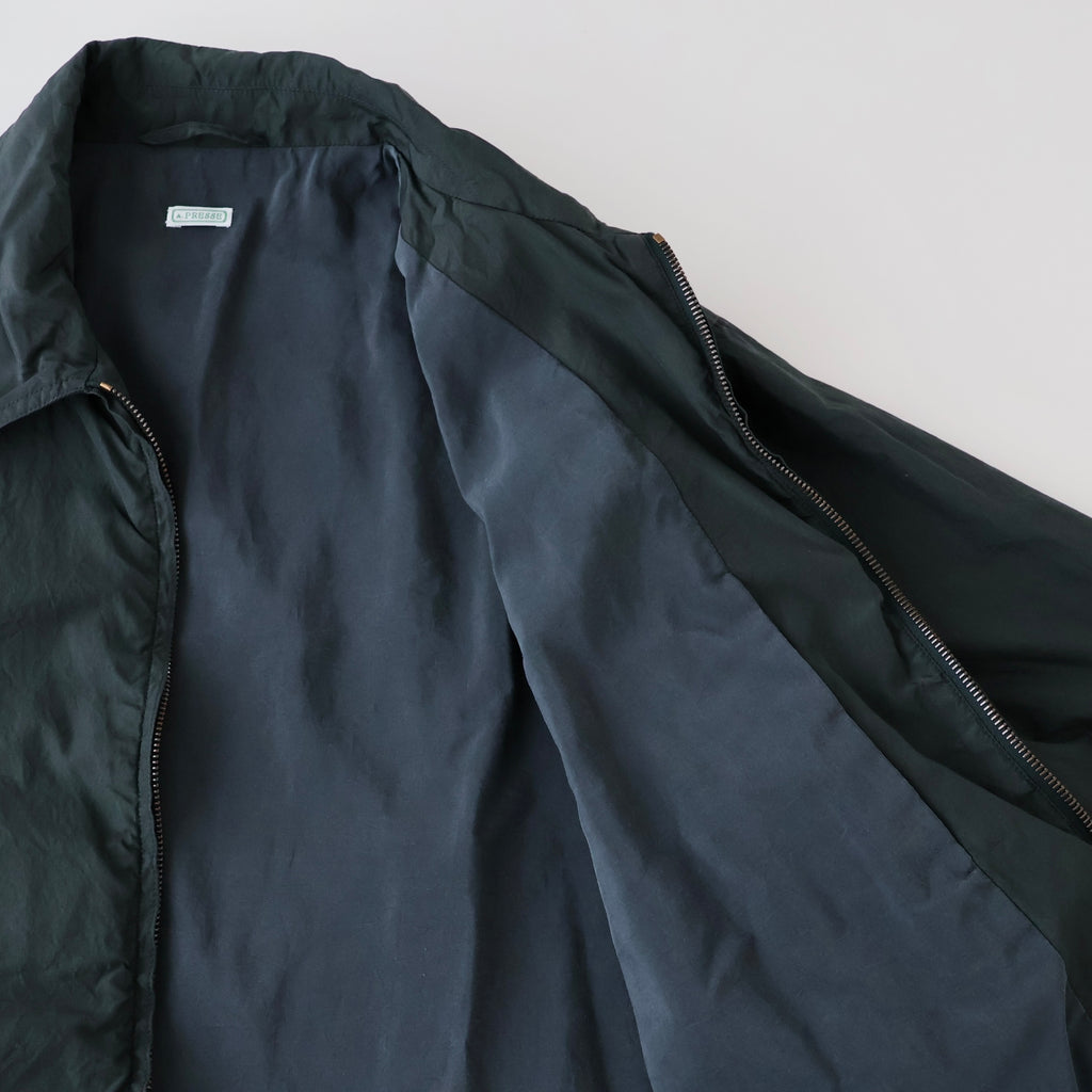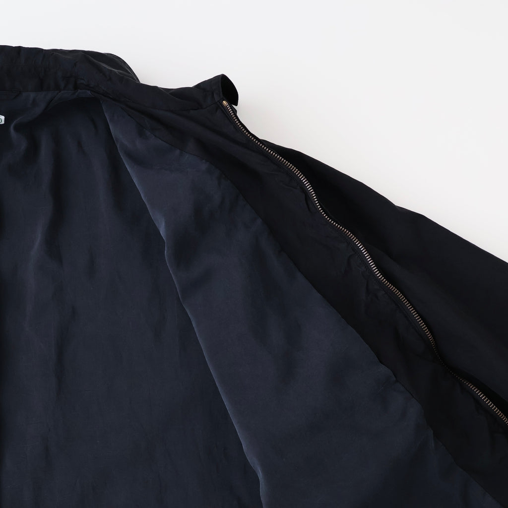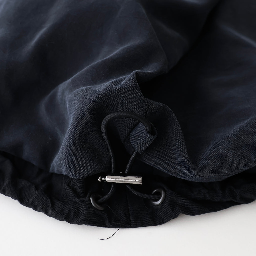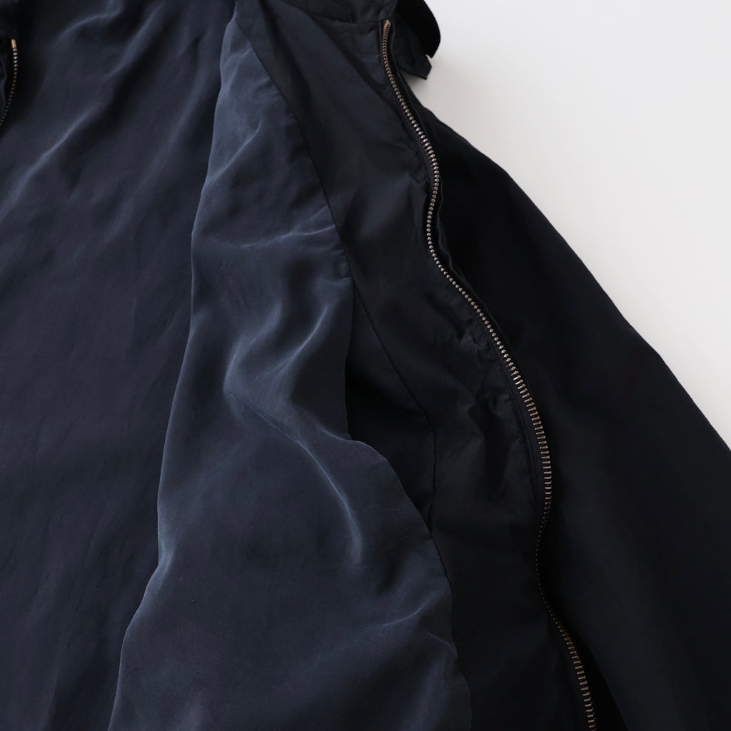 ナイロンのように見えて経に世界最高級と言われているブラジル産のフィラメントシルクを使用し、緯にエジプト産の細番手のコットンを引き揃えで織ったタフタ素材。高密度の経シルクに緯コットンを引き揃えで織る事により、平織り組織ながら柔らかめに若干のふくらみ感をだした。天然繊維最高級のフィラメントシルクにコットンを打つ事で、上質な光沢感と質感に仕上げた。