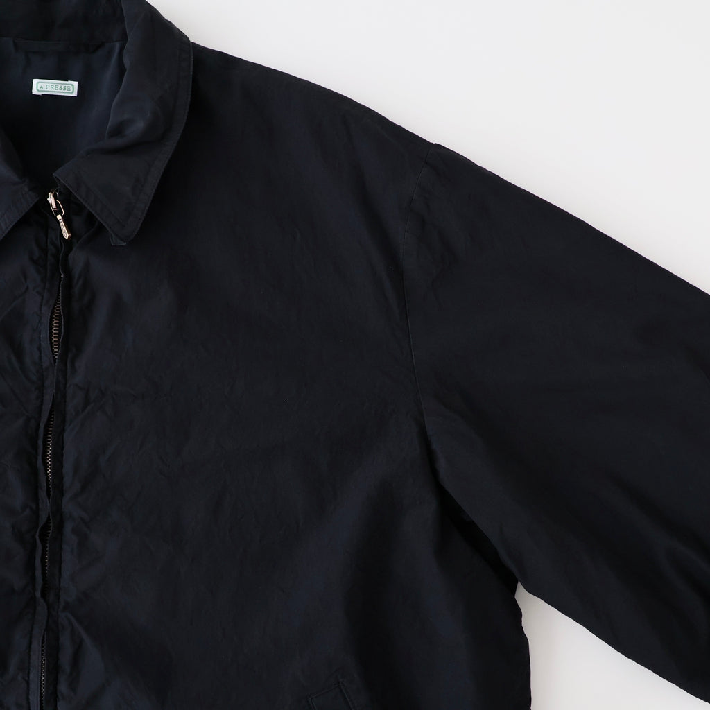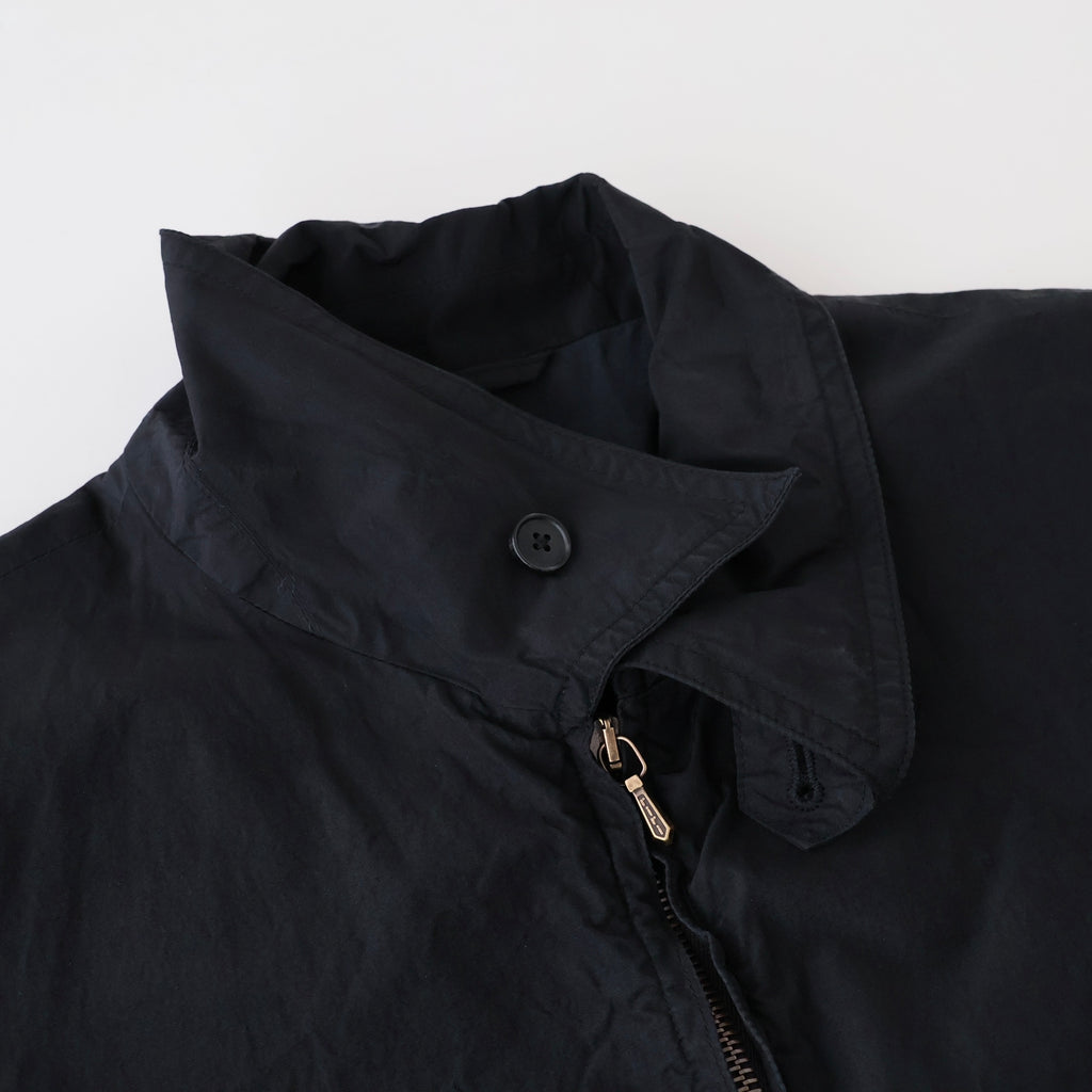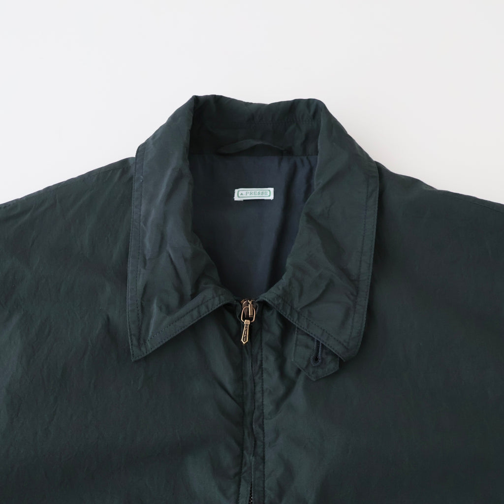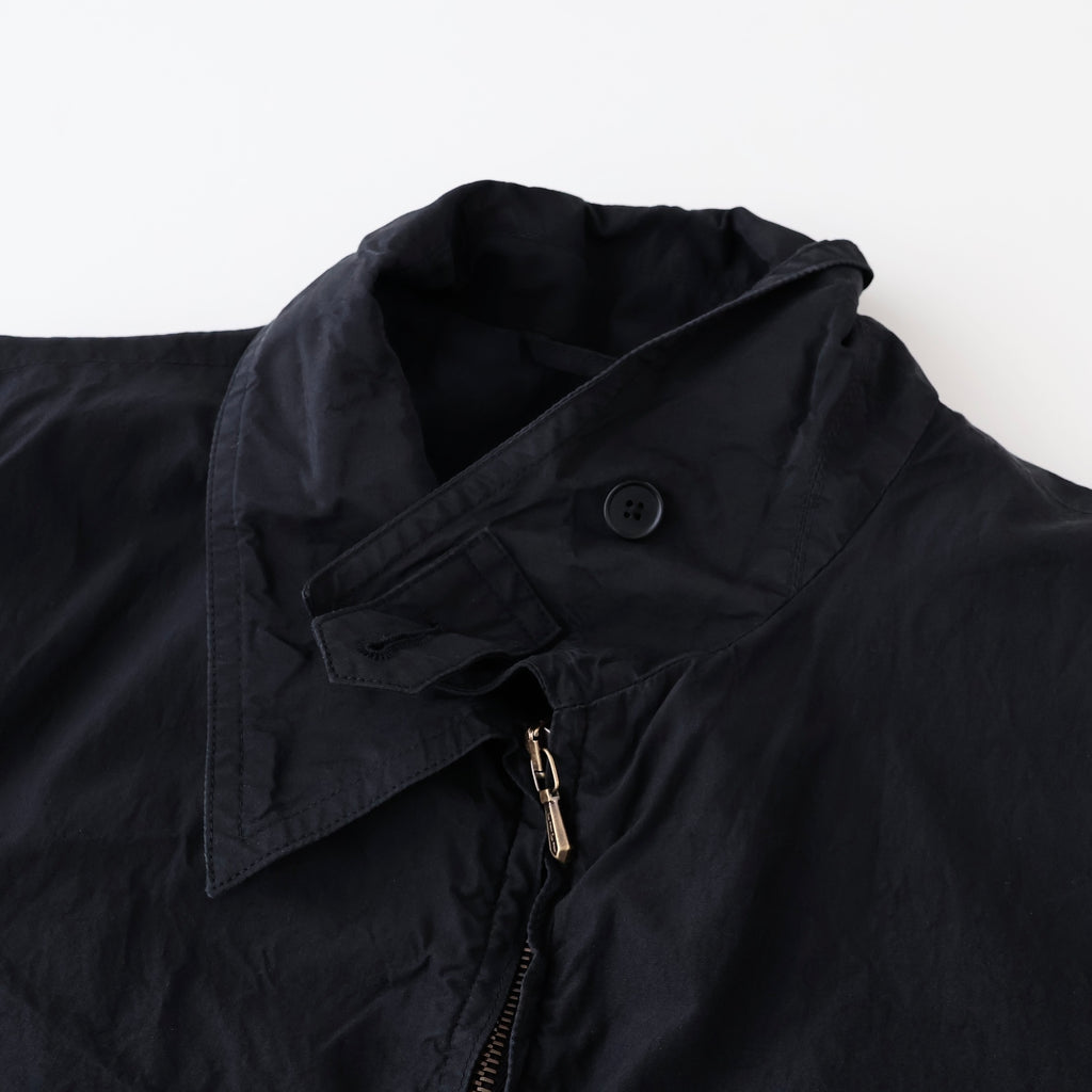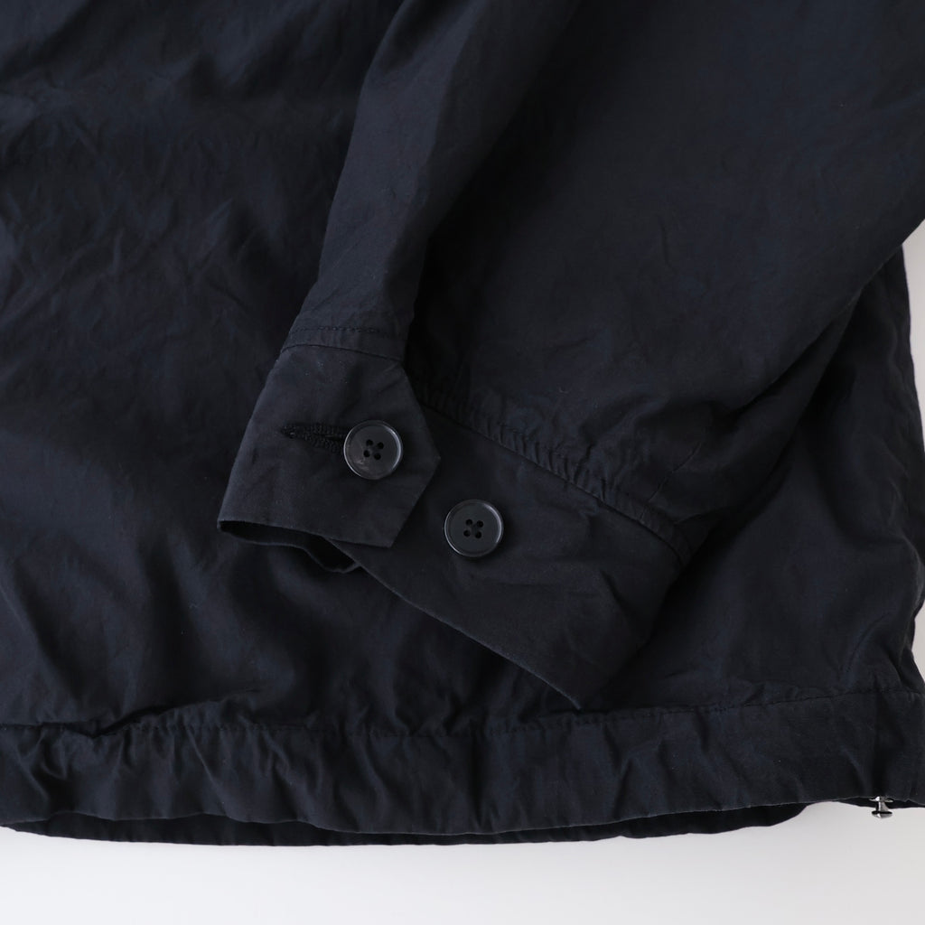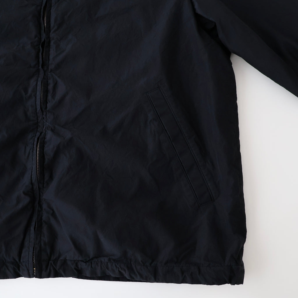 ナイロンのように見えて経に世界最高級と言われているブラジル産のフィラメントシルクを使用し、緯にエジプト産の細番手のコットンを引き揃えで織ったタフタ素材。高密度の経シルクに緯コットンを引き揃えで織る事により、平織り組織ながら柔らかめに若干のふくらみ感をだした。天然繊維最高級のフィラメントシルクにコットンを打つ事で、上質な光沢感と質感に仕上げた。