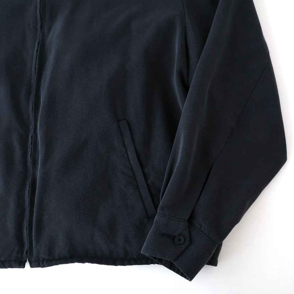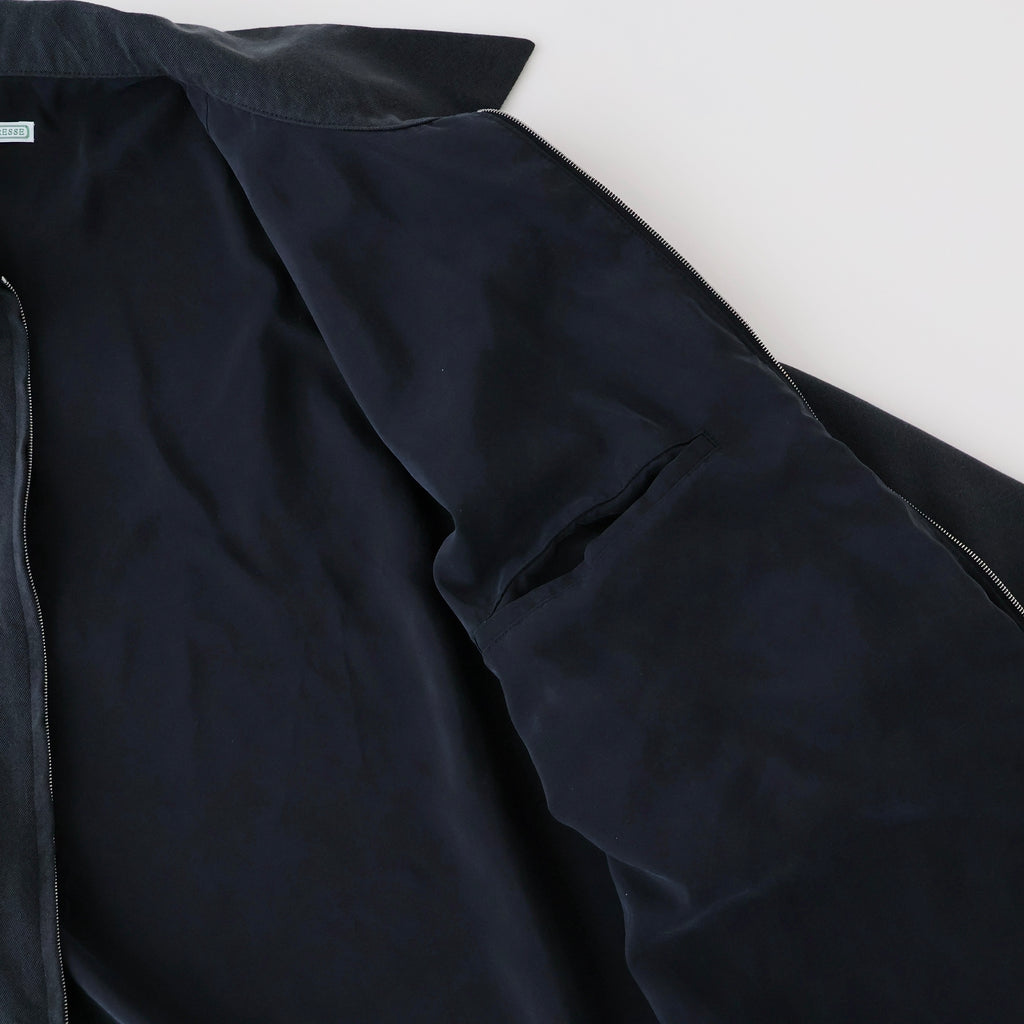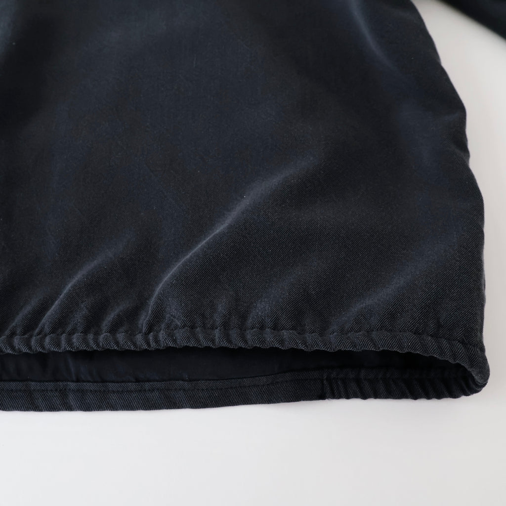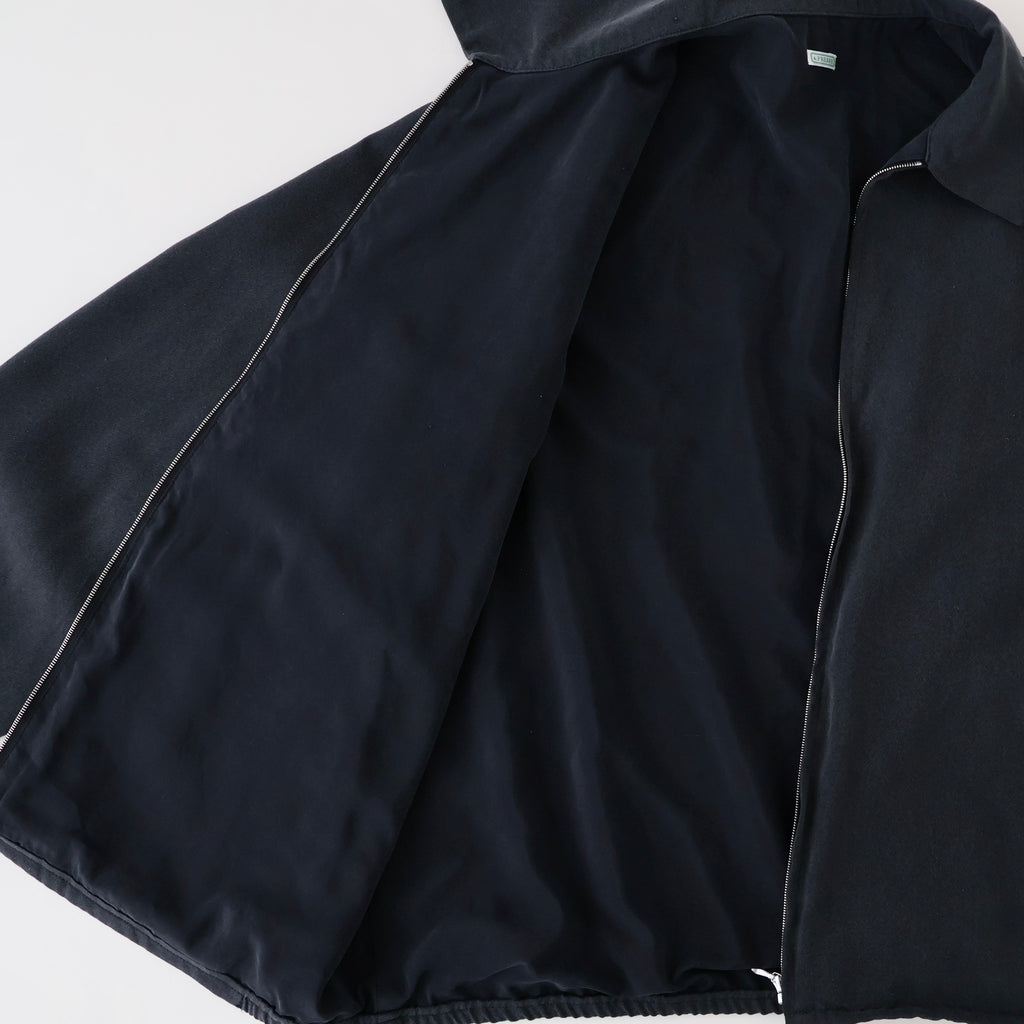表地は肉厚シルクチノクロスを使用。高密度で織り上げ、仕上げにヴィンテージ加工を施すことによって、表面がフィブリルし、シルクの光沢が消え、擦れて着古した様な表面感を表現した。手触りはシルク特有のぬめりがでて雰囲気のある表情に仕上がった。ライニングはワッシャー加工によって表面をフィブリルさせた軽くて滑りの良いシルクタフタを使用。フロントファスナーはスイスのriri。袖口の釦はオリジナルホーン釦。