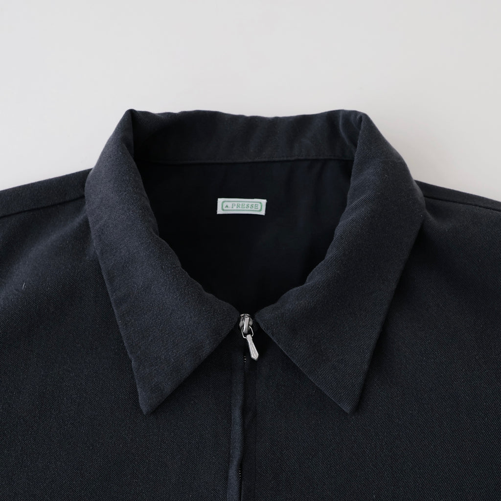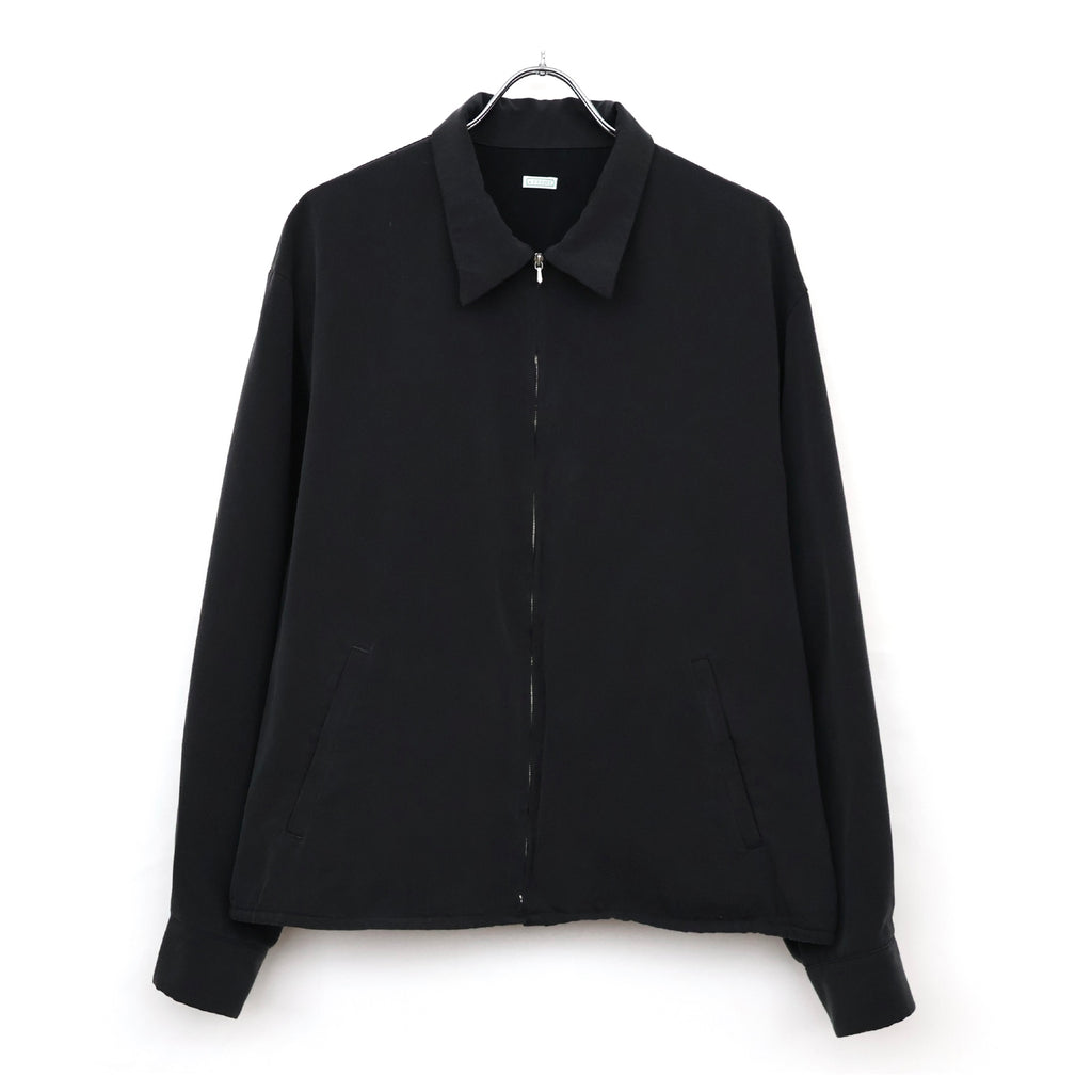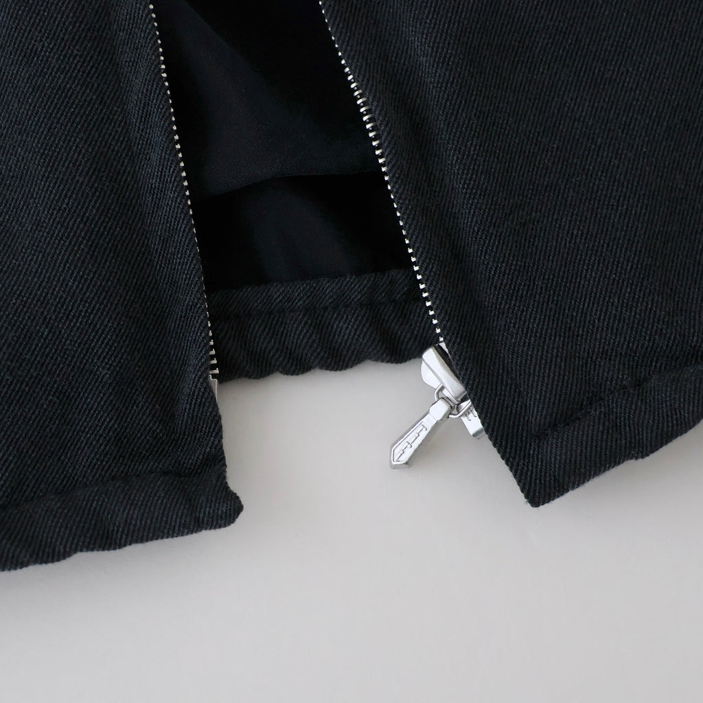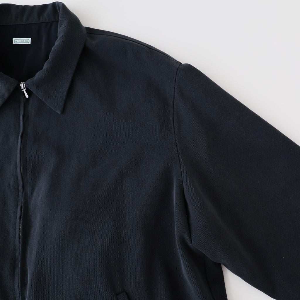 表地は肉厚シルクチノクロスを使用。高密度で織り上げ、仕上げにヴィンテージ加工を施すことによって、表面がフィブリルし、シルクの光沢が消え、擦れて着古した様な表面感を表現した。手触りはシルク特有のぬめりがでて雰囲気のある表情に仕上がった。ライニングはワッシャー加工によって表面をフィブリルさせた軽くて滑りの良いシルクタフタを使用。フロントファスナーはスイスのriri。袖口の釦はオリジナルホーン釦。