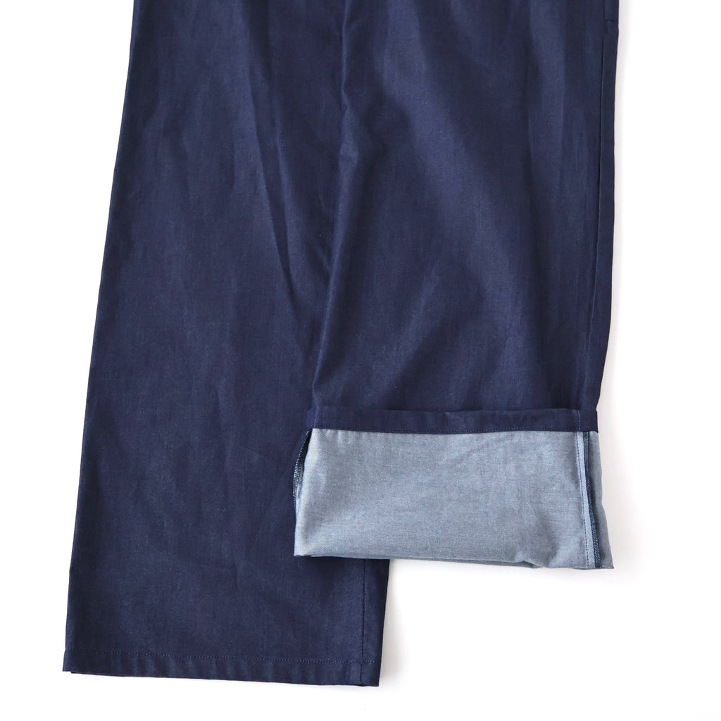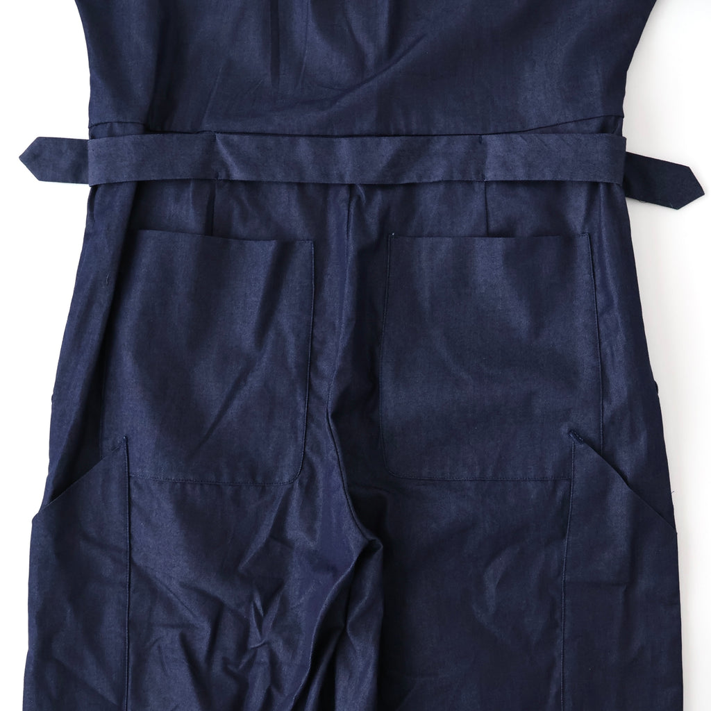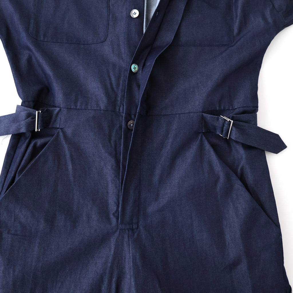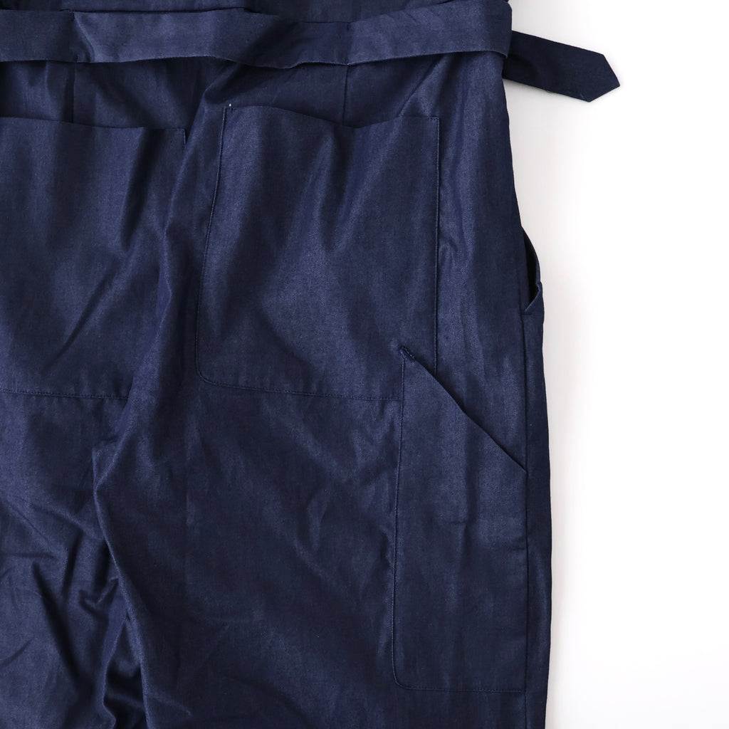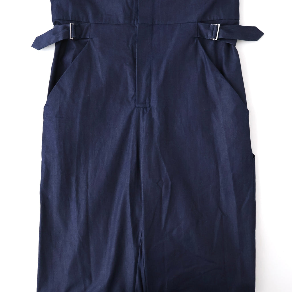 ストレートシルエットのパンツ部分。背中にタック。比翼ボタン。サイドポケット。黒蝶ボタン。スーピマコットンを使った薄く柔らかい艶のあるデニム。