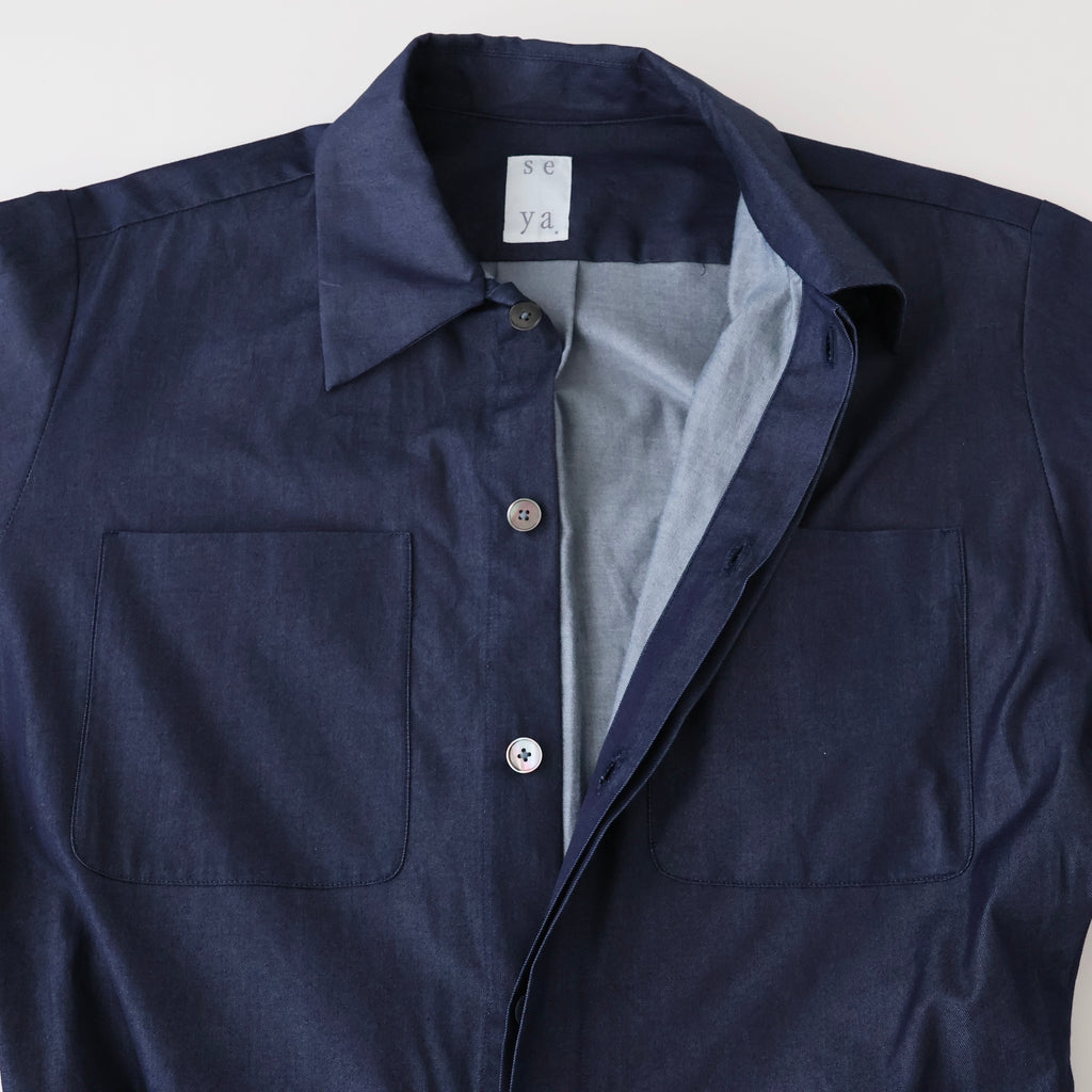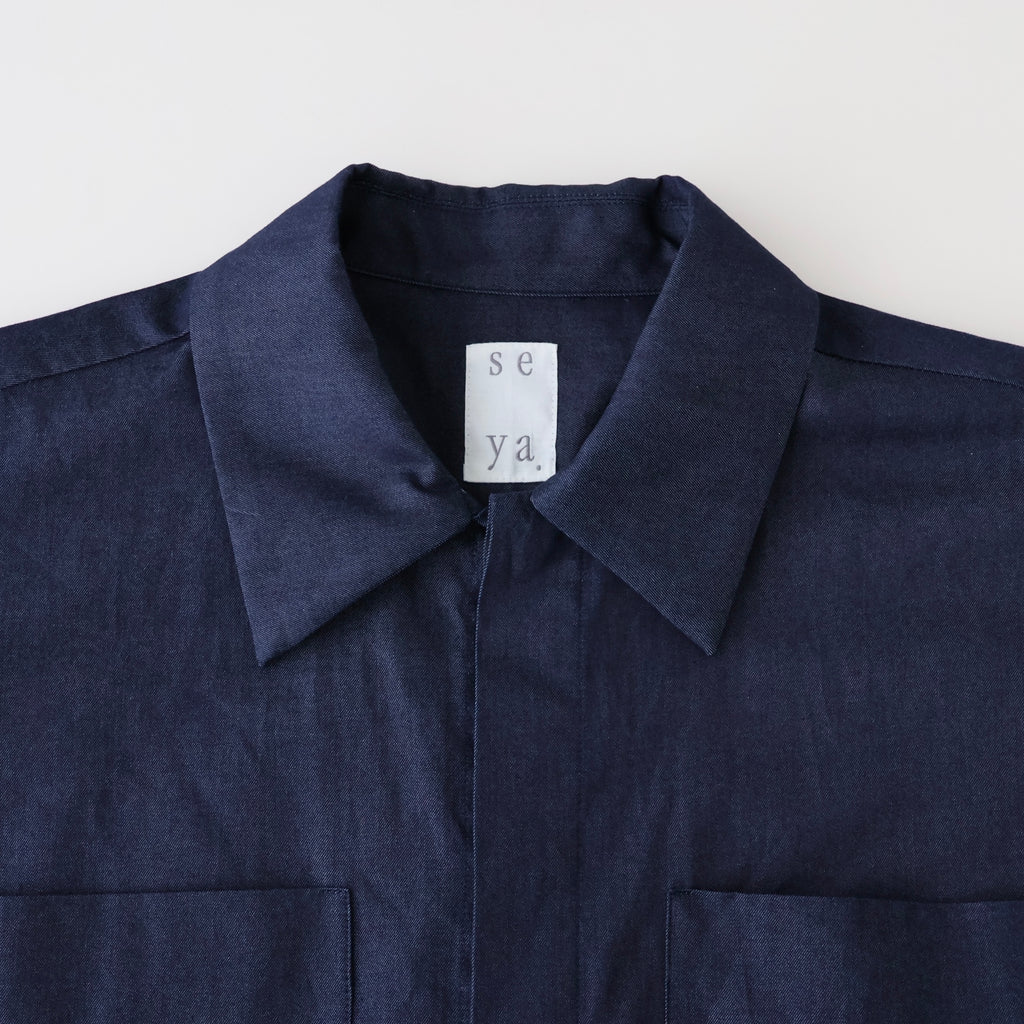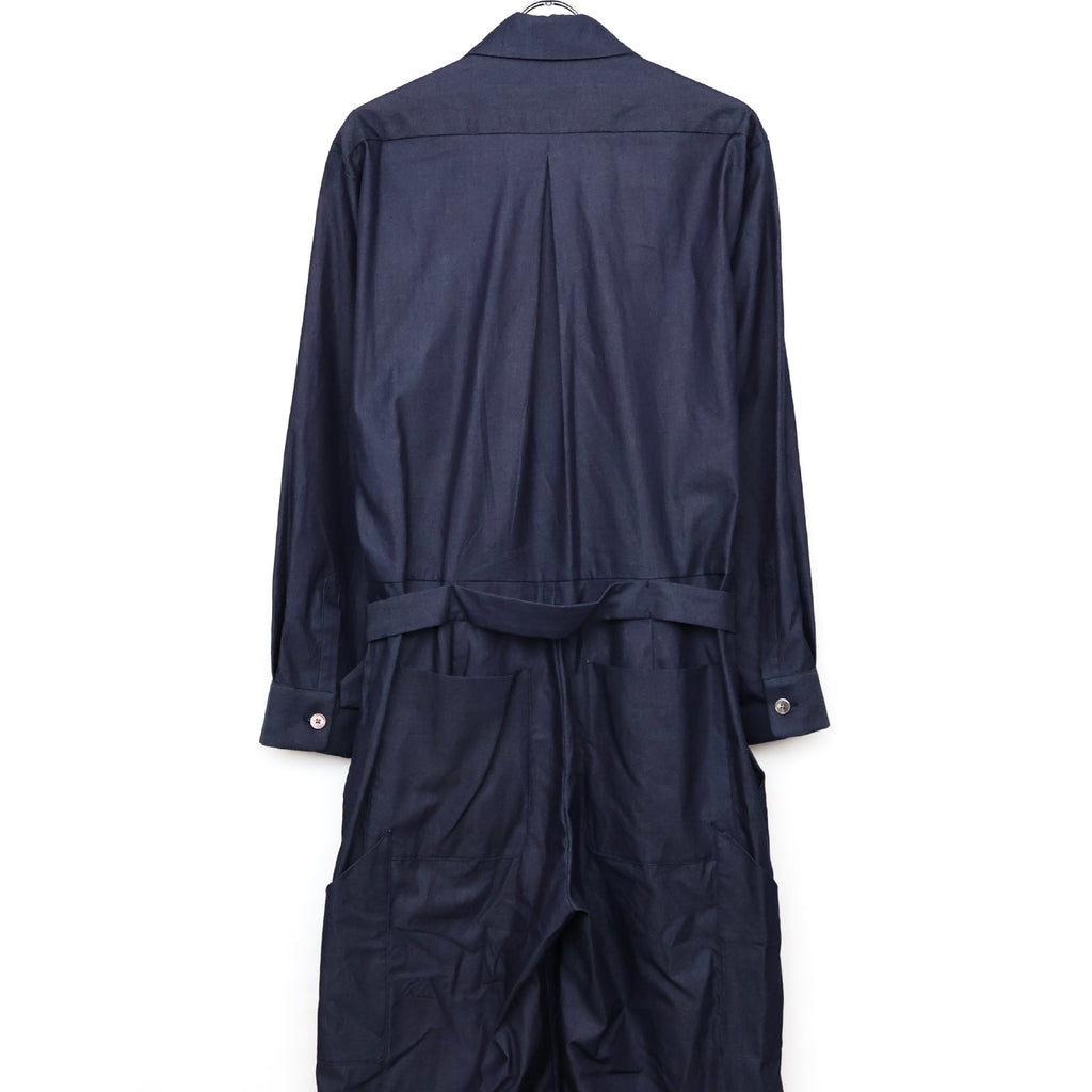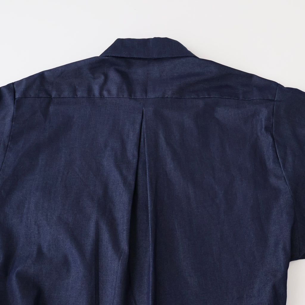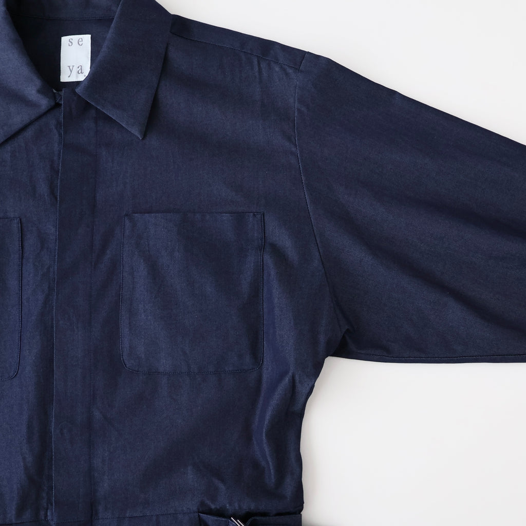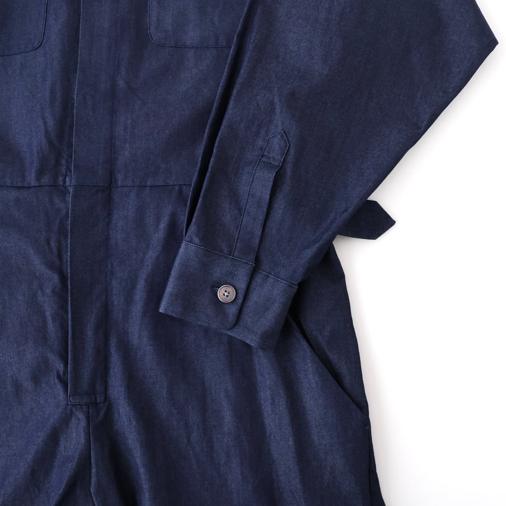 ストレートシルエットのパンツ部分。背中にタック。比翼ボタン。サイドポケット。黒蝶ボタン。スーピマコットンを使った薄く柔らかい艶のあるデニム。