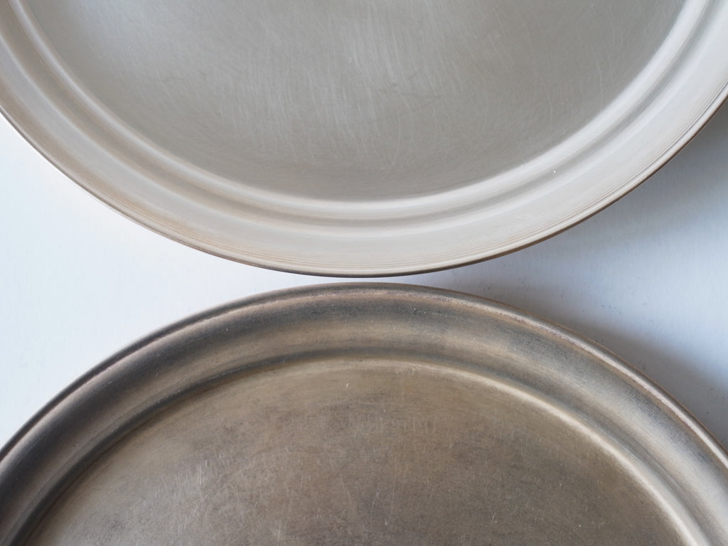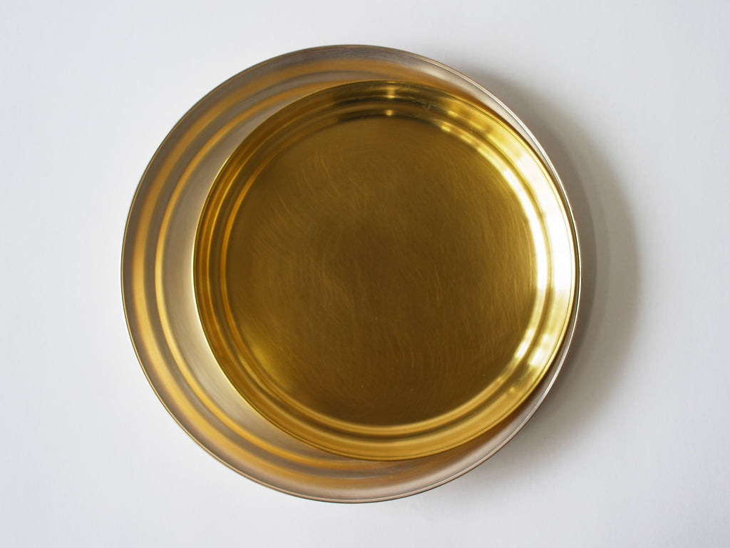 “へら絞り”という技法で一つ一つ成形され、丁寧に磨かれて完成した真鍮の盆です。金色のものは真鍮そのものの風合いを生かし、銀色の方は真鍮に銀メッキが施されています。水や油に反応しやすい素材だからこそ、お手入れがちょっと難しいのでは?と思われがち。しかし、その変化していく表情そのものがこの商品の最大の魅力と言っても過言ではありません。それは一筆一筆ゆっくりと加筆されてゆく絵のようです。移ろってゆく丸い絵画、どうぞ日々ご鑑賞ください。