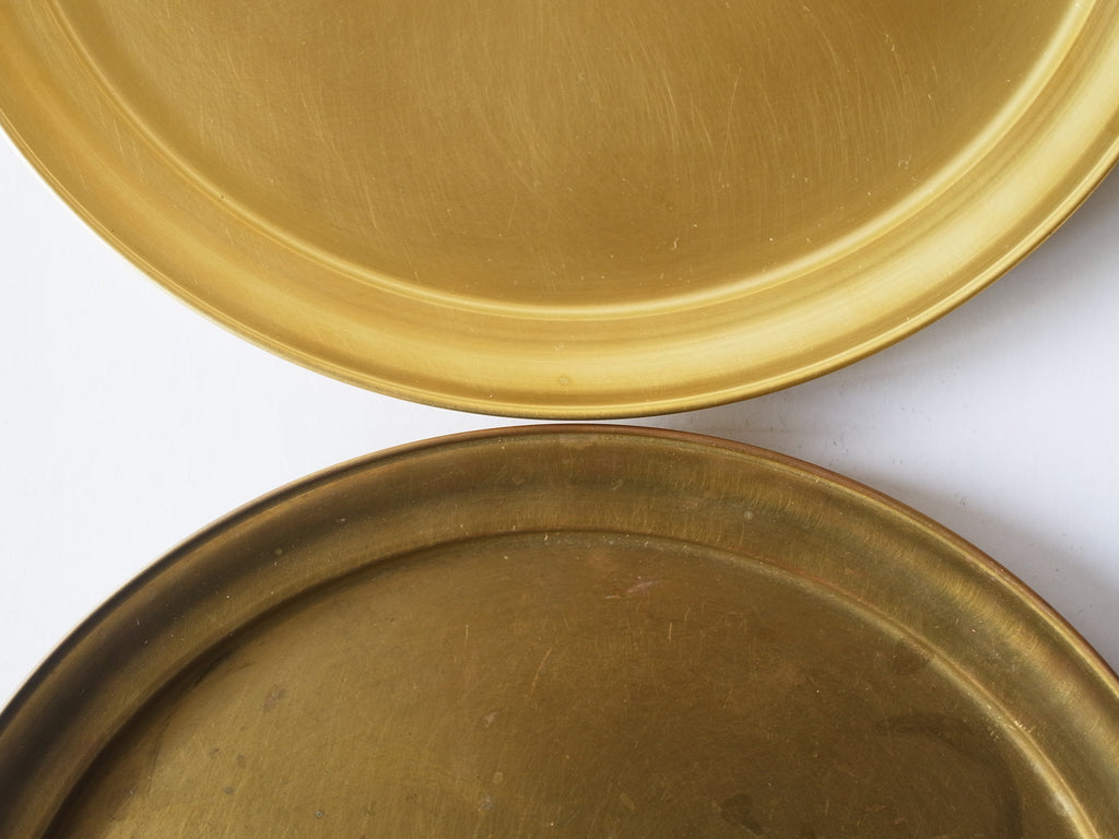 “へら絞り”という技法で一つ一つ成形され、丁寧に磨かれて完成した真鍮の盆です。金色のものは真鍮そのものの風合いを生かし、銀色の方は真鍮に銀メッキが施されています。水や油に反応しやすい素材だからこそ、お手入れがちょっと難しいのでは?と思われがち。しかし、その変化していく表情そのものがこの商品の最大の魅力と言っても過言ではありません。それは一筆一筆ゆっくりと加筆されてゆく絵のようです。移ろってゆく丸い絵画、どうぞ日々ご鑑賞ください。