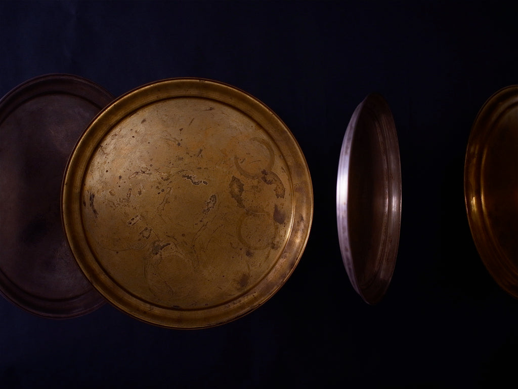 “へら絞り”という技法で一つ一つ成形され、丁寧に磨かれて完成した真鍮の盆です。金色のものは真鍮そのものの風合いを生かし、銀色の方は真鍮に銀メッキが施されています。水や油に反応しやすい素材だからこそ、お手入れがちょっと難しいのでは?と思われがち。しかし、その変化していく表情そのものがこの商品の最大の魅力と言っても過言ではありません。それは一筆一筆ゆっくりと加筆されてゆく絵のようです。移ろってゆく丸い絵画、どうぞ日々ご鑑賞ください。