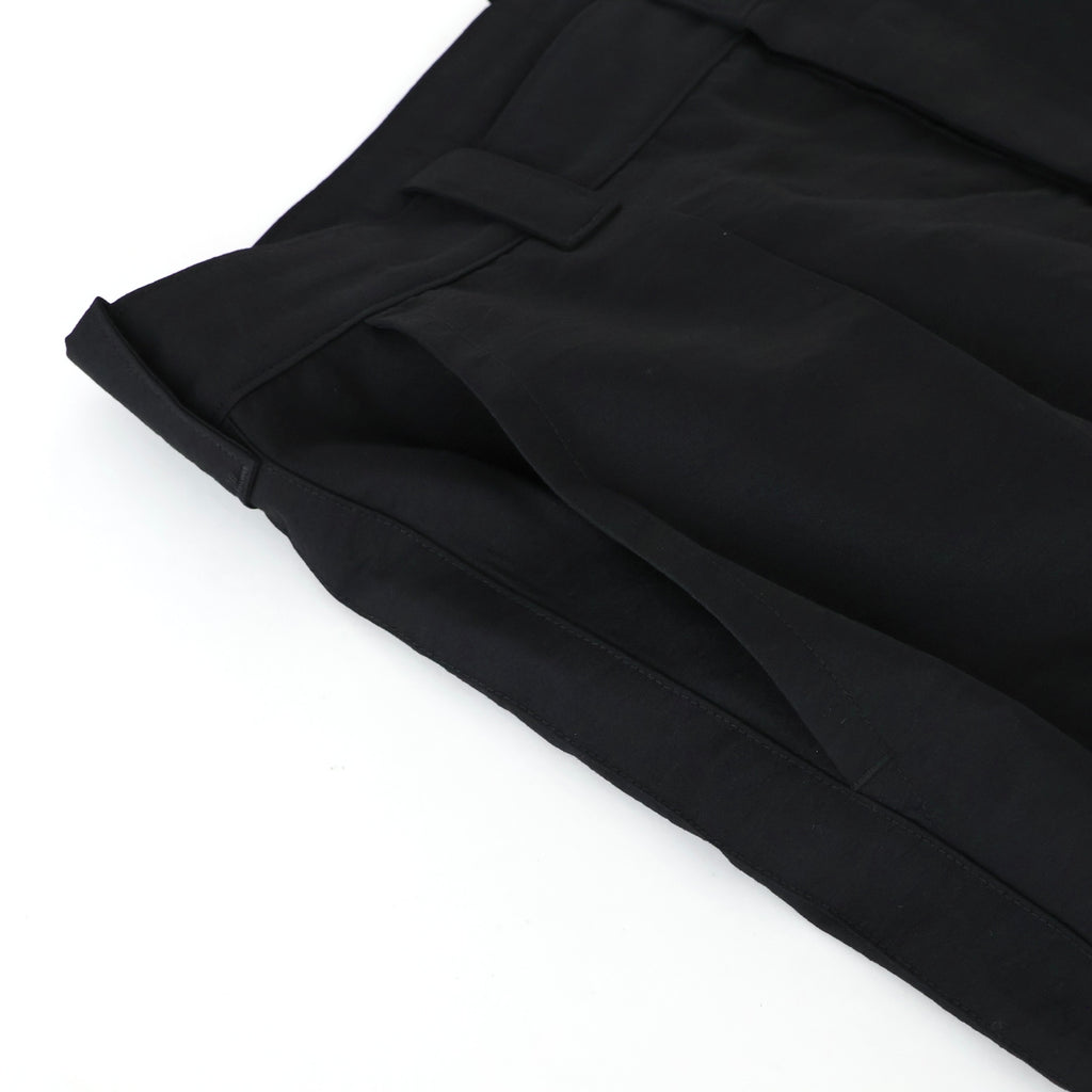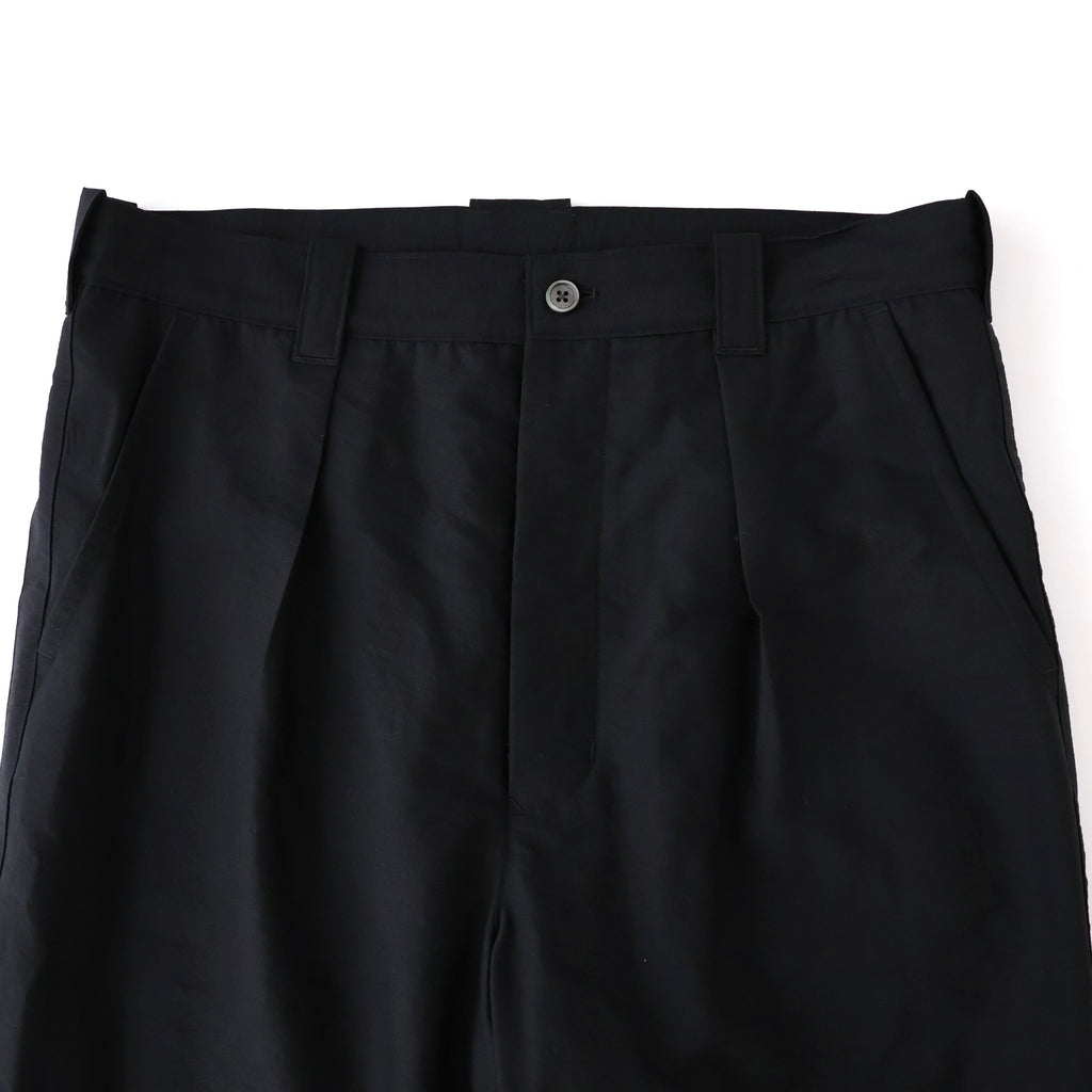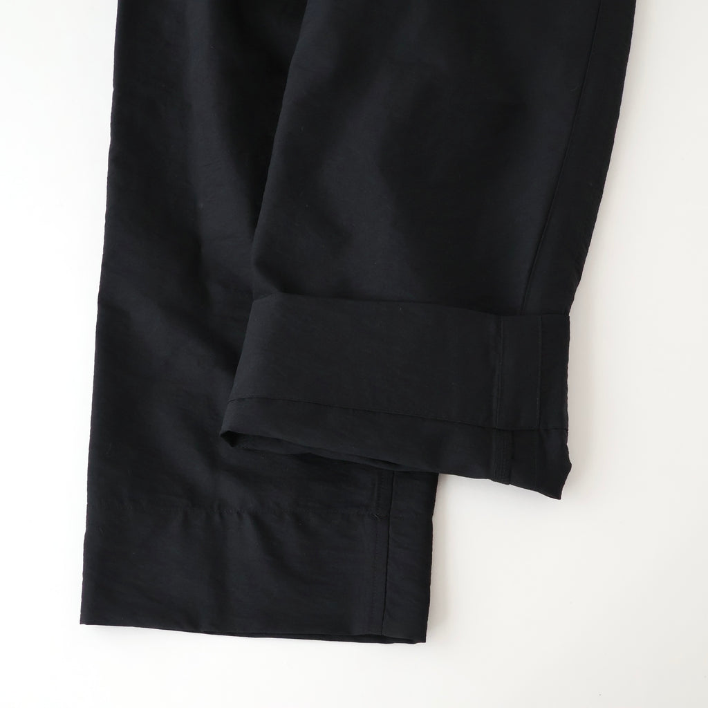 軽快に穿くことができるよう、ウエストにはドローコードを配し、ベルトをつけるも良し、そのまま紐で絞るも良しな、2WAY使用にアレンジいたしました。オリジナルのディテールでもある、1プリーツのフロントも特徴的。ヒップに余裕を持たせた着心地の良いバランスで作成いたしました。