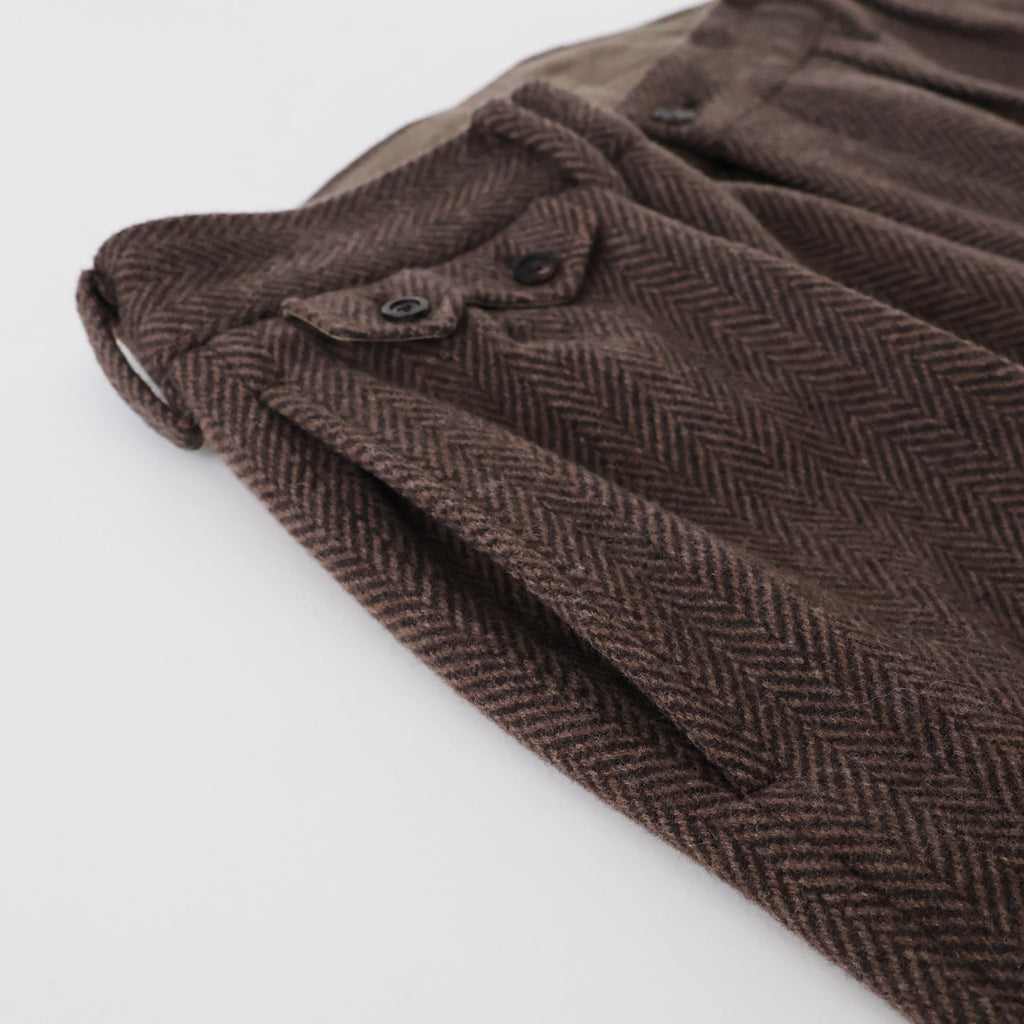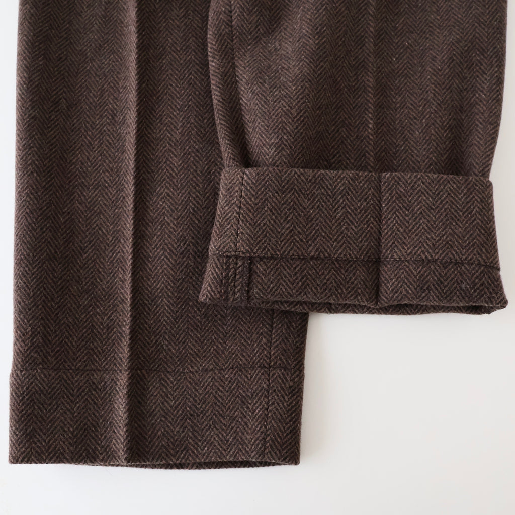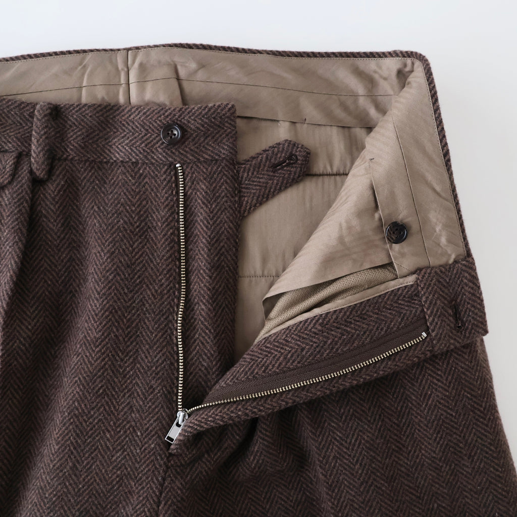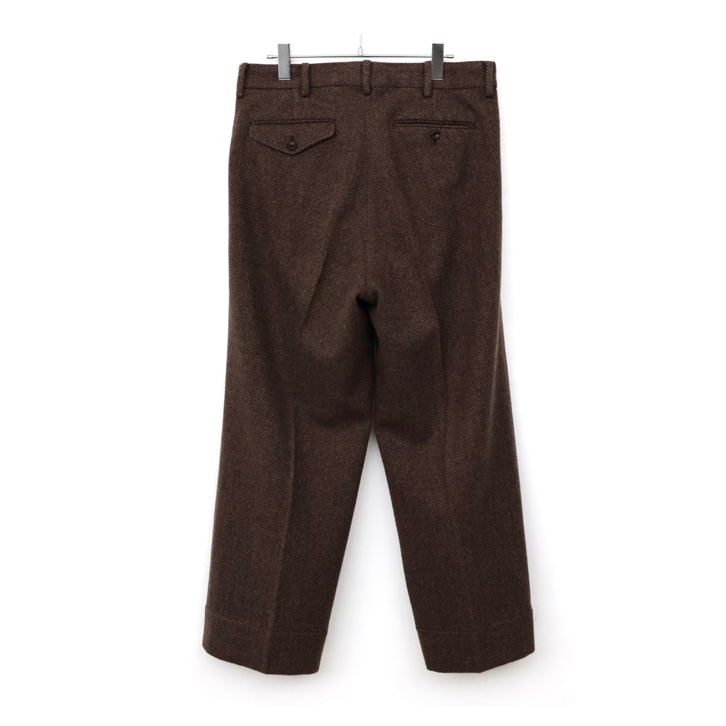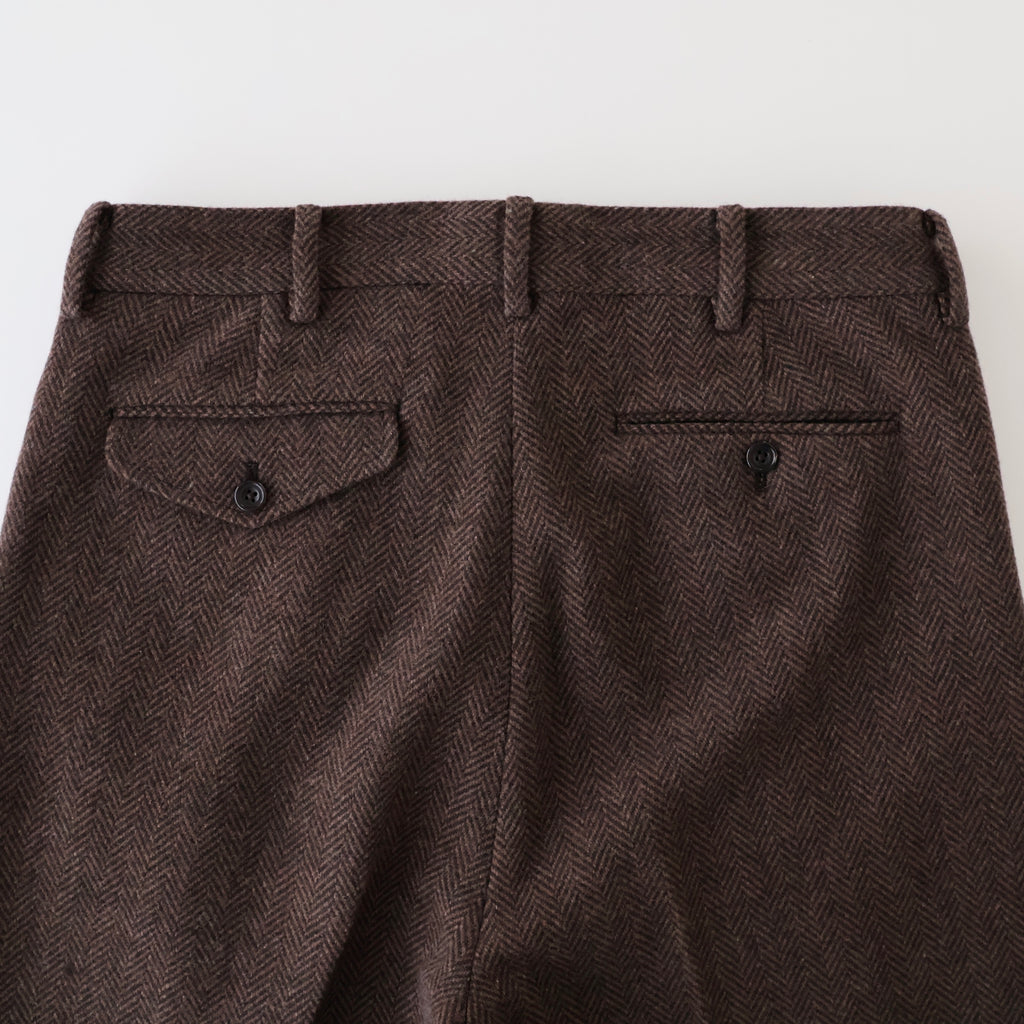 今回はスーパー120を使用したソフトで温かみのあるオリジナルツイードを作成。ツイードの男らしい外観とギャップのある上質な肌触り、尚且つそのアウトドア感溢れる素材をアメリカントラディショナルなデザインに落とし込み、カウボーイディテールをアクセントに加える、まさにアンライクリーな1本です。