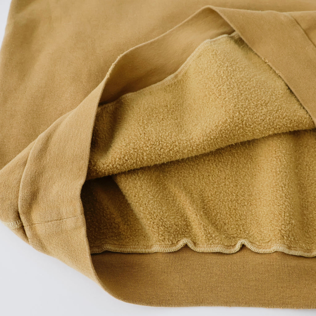 表地はヴィンテージを解析して作った吊り裏毛、1時間に1メートルというゆっくりとしたスピードでしか編み立てられないが、糸に余計な負荷を掛けないで編み上げることで、肉厚ながら固くならず、ふっくらとした風合いで仕上げた。
