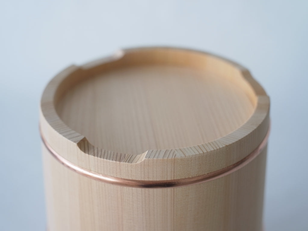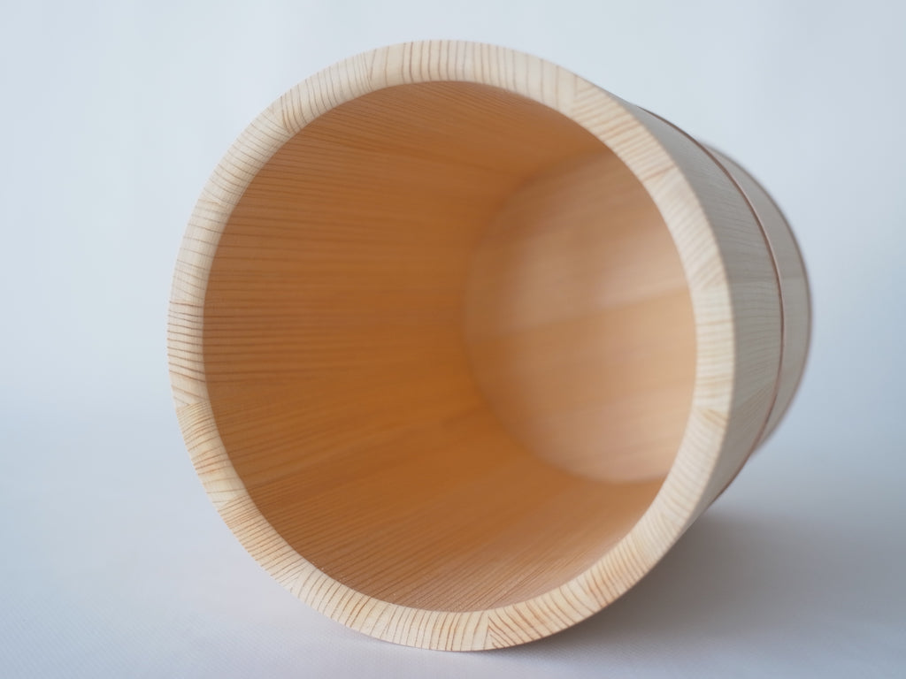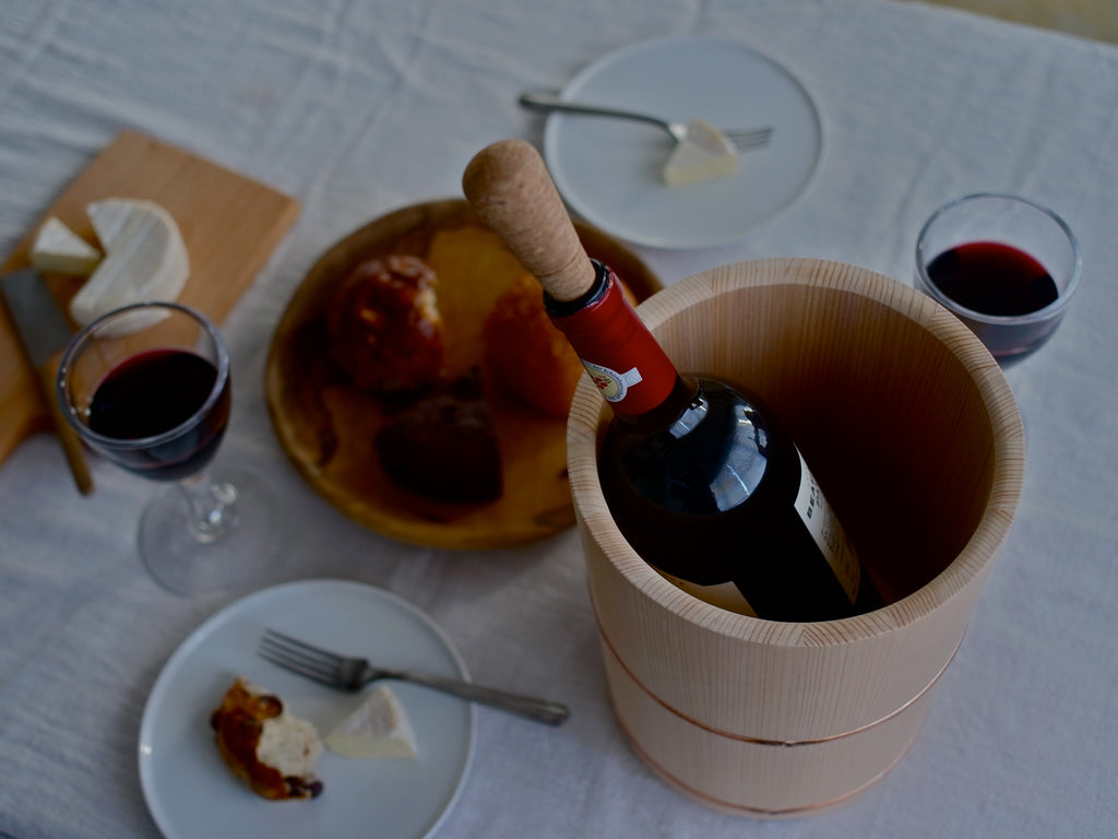 無垢の木曽さわらを使用したワインクーラーは、木目が美しく、凛とした佇まいをしています。木の桶は熱を伝えにくいので、温度変化がしにくく、一定の温度でワインを冷やすことができます。氷が溶けにくく、外側に水滴がつきにくいという利点も魅力的。金属製のものとは違い、運ぶ時に手が触れても冷たくありません。見た目は木の暖かみを残しながら、中はしっかりと保冷してくれる、ホットでクールな存在です。