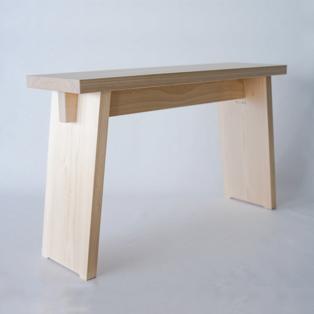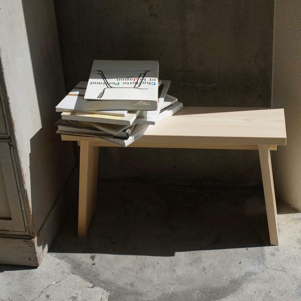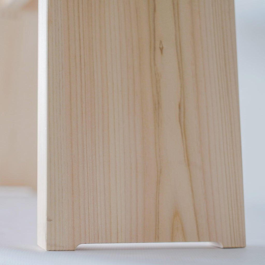 木曽五木の一つである東濃檜を使用し、昔から日本建築に用いられているほぞ組みによって制作することにより、シンプルでありながら堅牢な作りを実現しました。奥行きは狭めで幅は広め、この腰掛けの魅力は何と言っても手頃なサイズ感と、持ち運びのしやすさでしょう。玄関での靴の脱ぎ履き、ベランダでの一服や洗濯カゴを置く台として。大きな椅子を運んでくるにはちょっと、、という小ぶりなスペースで大活躍!ご家庭にとどまらず、店舗でもお客様の試着の際などに活用していただけます。また、腰を掛ける以外にも壁に横付けしてちょっとした棚にしたり、ミニテーブルとして用立てることもできます。