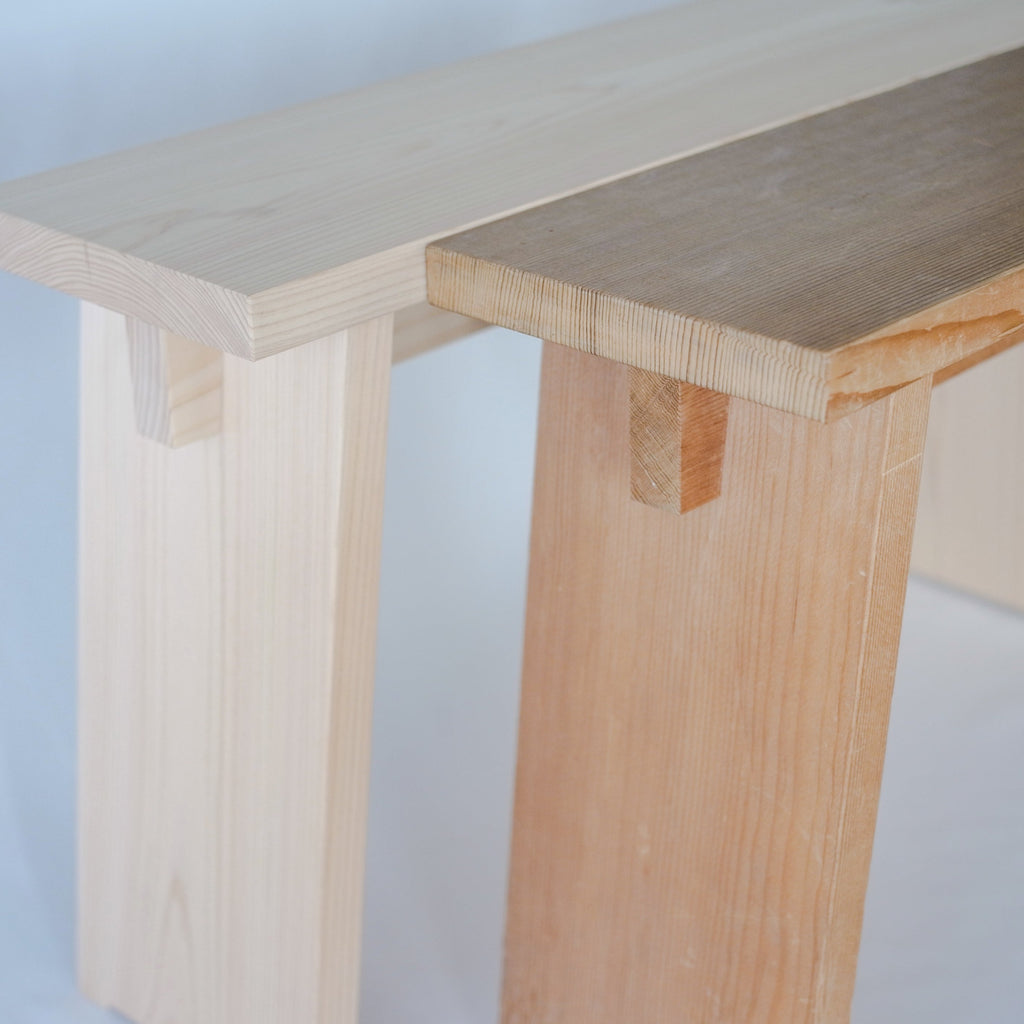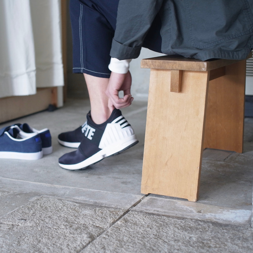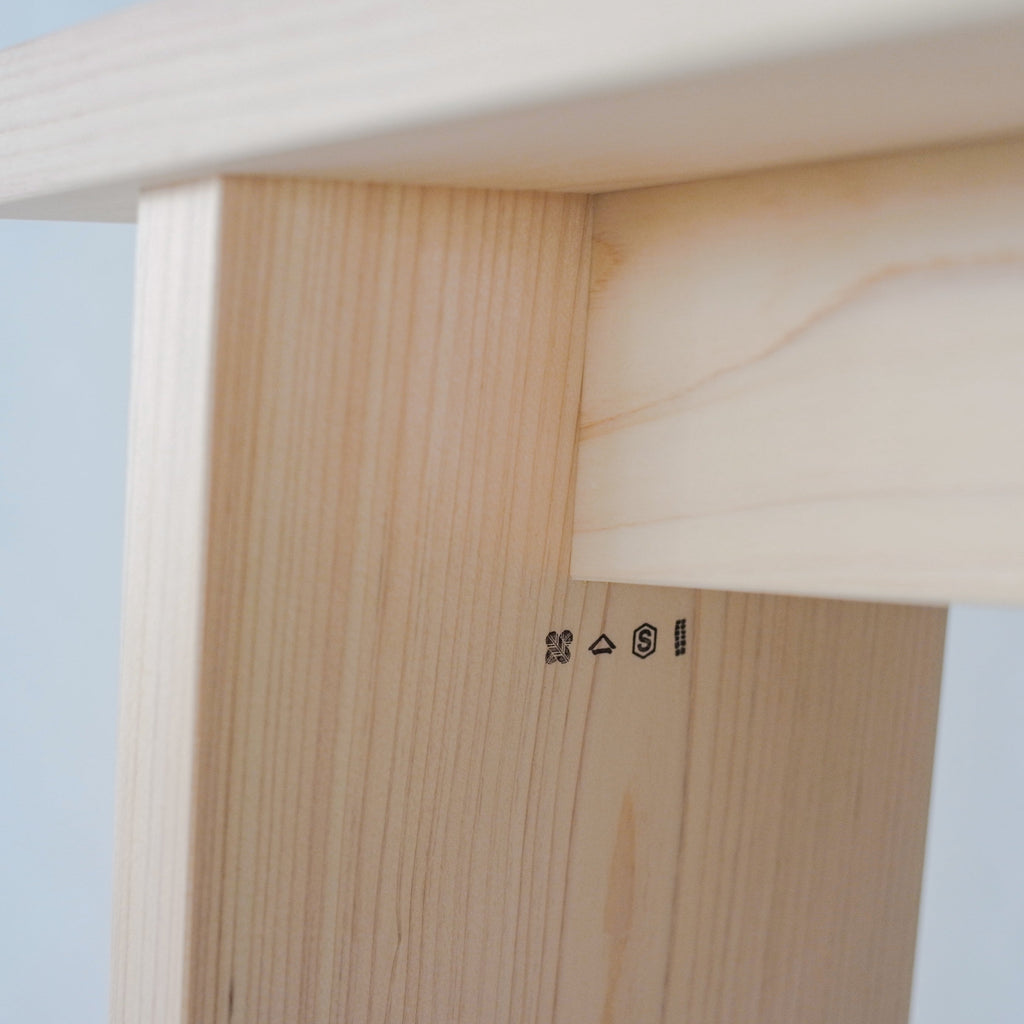 木曽五木の一つである東濃檜を使用し、昔から日本建築に用いられているほぞ組みによって制作することにより、シンプルでありながら堅牢な作りを実現しました。奥行きは狭めで幅は広め、この腰掛けの魅力は何と言っても手頃なサイズ感と、持ち運びのしやすさでしょう。玄関での靴の脱ぎ履き、ベランダでの一服や洗濯カゴを置く台として。大きな椅子を運んでくるにはちょっと、、という小ぶりなスペースで大活躍!ご家庭にとどまらず、店舗でもお客様の試着の際などに活用していただけます。また、腰を掛ける以外にも壁に横付けしてちょっとした棚にしたり、ミニテーブルとして用立てることもできます。